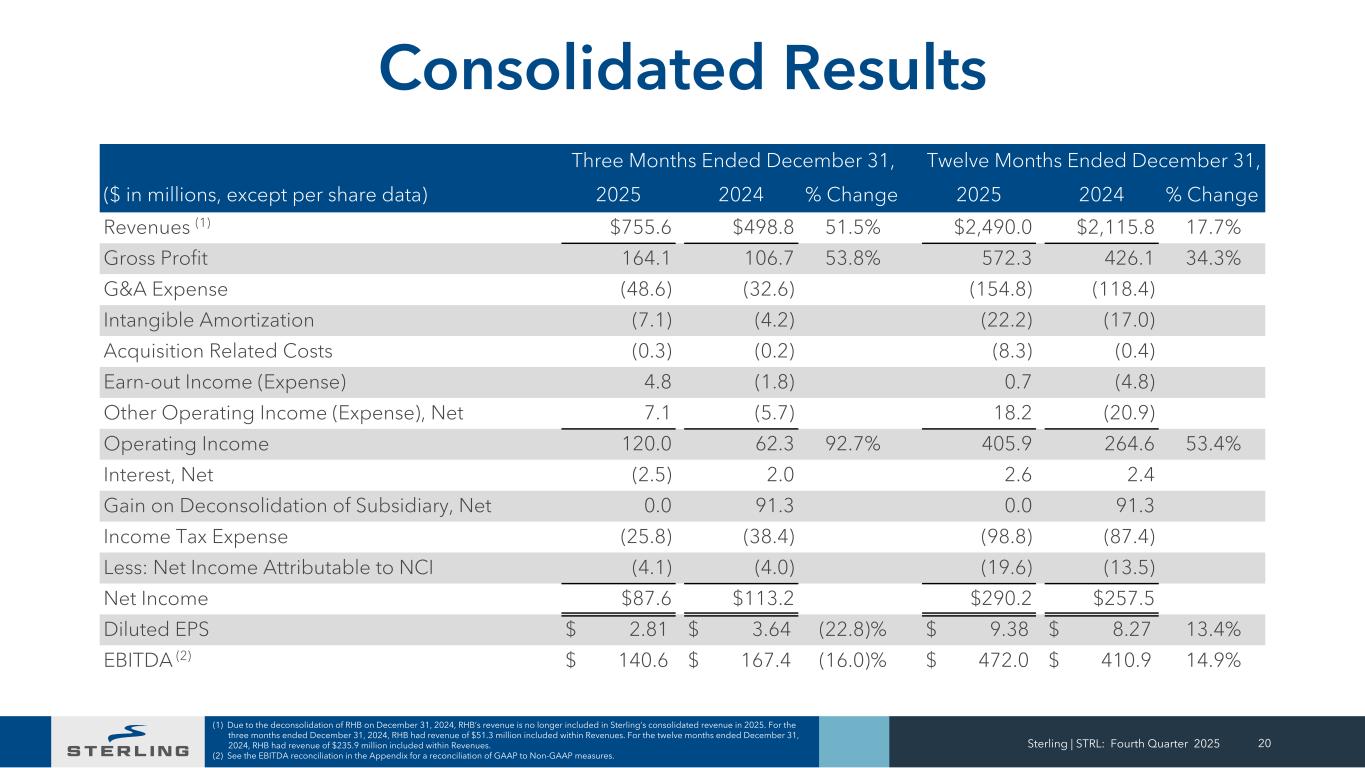 Consolidated Results Three Months Ended December 31, Twelve Months Ended December 31, ($ in millions, except per share data) 2025 2024 % Change 2025 2024 % Change Revenues (1) $755.6 $498.8 51.5% $2,490.0 $2,115.8 17.7% Gross Profit 164.1 106.7 53.8% 572.3 426.1 34.3% G&A Expense (48.6) (32.6) (154.8) (118.4) Intangible Amortization (7.1) (4.2) (22.2) (17.0) Acquisition Related Costs (0.3) (0.2) (8.3) (0.4) Earn-out Income (Expense) 4.8 (1.8) 0.7 (4.8) Other Operating Income (Expense), Net 7.1 (5.7) 18.2 (20.9) Operating Income 120.0 62.3 92.7% 405.9 264.6 53.4% Interest, Net (2.5) 2.0 2.6 2.4 Gain on Deconsolidation of Subsidiary, Net 0.0 91.3 0.0 91.3 Income Tax Expense (25.8) (38.4) (98.8) (87.4) Less: Net Income Attributable to NCI (4.1) (4.0) (19.6) (13.5) Net Income $87.6 $113.2 $290.2 $257.5 Diluted EPS $ 2.81 $ 3.64 (22.8)% $ 9.38 $ 8.27 13.4% EBITDA (2) $ 140.6 $ 167.4 (16.0)% $ 472.0 $ 410.9 14.9% (1) Due to the deconsolidation of RHB on December 31, 2024, RHB’s revenue is no longer included in Sterling’s consolidated revenue in 2025. For the three months ended December 31, 2024, RHB had revenue of $51.3 million included within Revenues. For the twelve months ended December 31, 2024, RHB had revenue of $235.9 million included within Revenues. (2) See the EBITDA reconciliation in the Appendix for a reconciliation of GAAP to Non-GAAP measures. Sterling | STRL: Fourth Quarter 2025 20