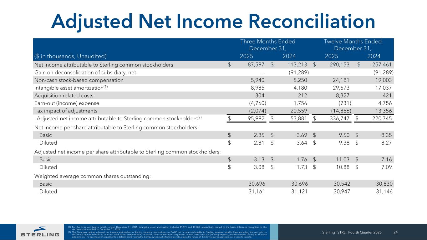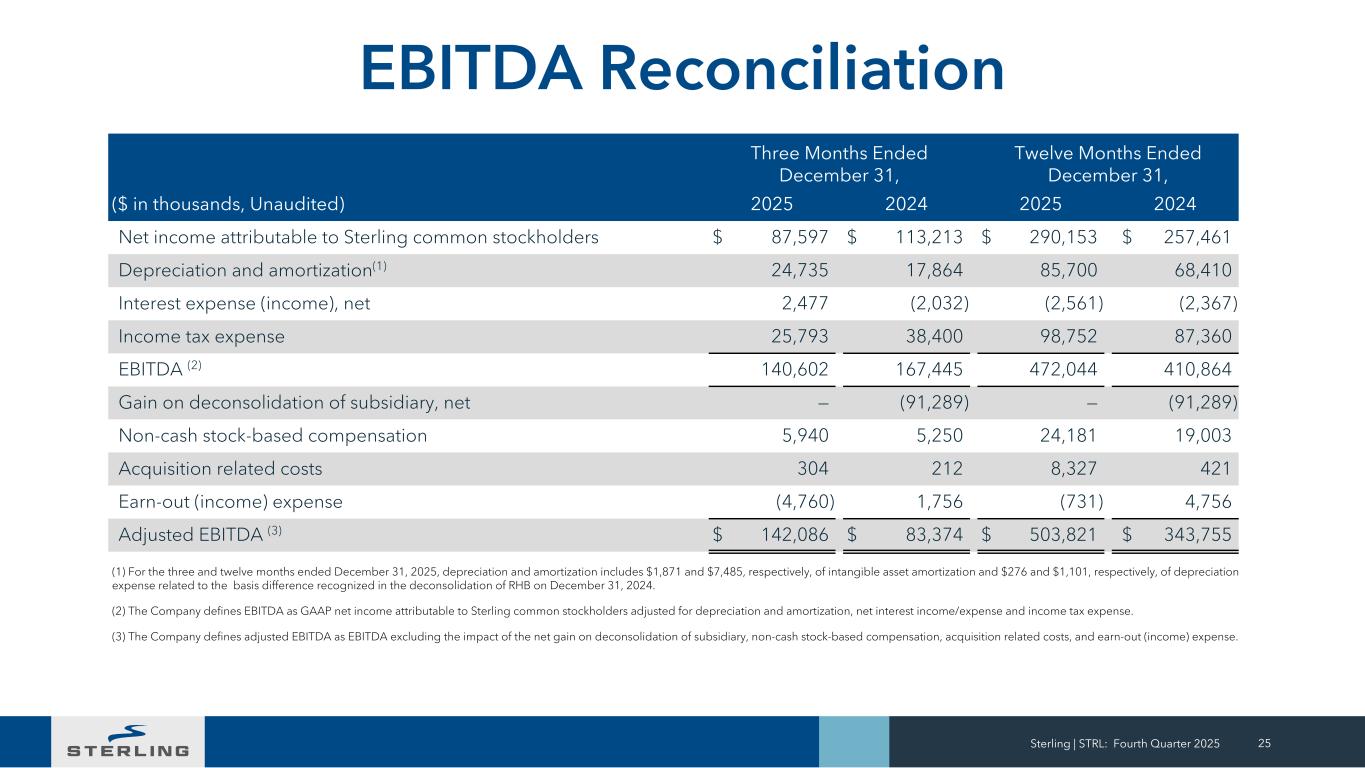 Sterling | STRL: Fourth Quarter 2025 24 (1) For the three and twelve months ended December 31, 2025, intangible asset amortization includes $1,871 and $7,485, respectively related to the basis difference recognized in the deconsolidation of RHB on December 31, 2024. (2) The Company defines adjusted net income attributable to Sterling common stockholders as GAAP net income attributable to Sterling common stockholders excluding the net gain on deconsolidation of subsidiary, non-cash stock-based compensation, intangible asset amortization, acquisition related costs, earn-out (income) expense, and the income tax impact of these adjustments. The tax impact of adjustments is determined by using the Company's annual effective tax rate, unless the nature of the item requires application of a specific tax rate. Three Months Ended December 31, Twelve Months Ended December 31, ($ in thousands, Unaudited) 2025 2024 2025 2024 Net income attributable to Sterling common stockholders $ 87,597 $ 113,213 $ 290,153 $ 257,461 Gain on deconsolidation of subsidiary, net — (91,289) — (91,289) Non-cash stock-based compensation 5,940 5,250 24,181 19,003 Intangible asset amortization(1) 8,985 4,180 29,673 17,037 Acquisition related costs 304 212 8,327 421 Earn-out (income) expense (4,760) 1,756 (731) 4,756 Tax impact of adjustments (2,074) 20,559 (14,856) 13,356 Adjusted net income attributable to Sterling common stockholders(2) $ 95,992 $ 53,881 $ 336,747 $ 220,745 Net income per share attributable to Sterling common stockholders: Basic $ 2.85 $ 3.69 $ 9.50 $ 8.35 Diluted $ 2.81 $ 3.64 $ 9.38 $ 8.27 Adjusted net income per share attributable to Sterling common stockholders: Basic $ 3.13 $ 1.76 $ 11.03 $ 7.16 Diluted $ 3.08 $ 1.73 $ 10.88 $ 7.09 Weighted average common shares outstanding: Basic 30,696 30,696 30,542 30,830 Diluted 31,161 31,121 30,947 31,146 Adjusted Net Income Reconciliation