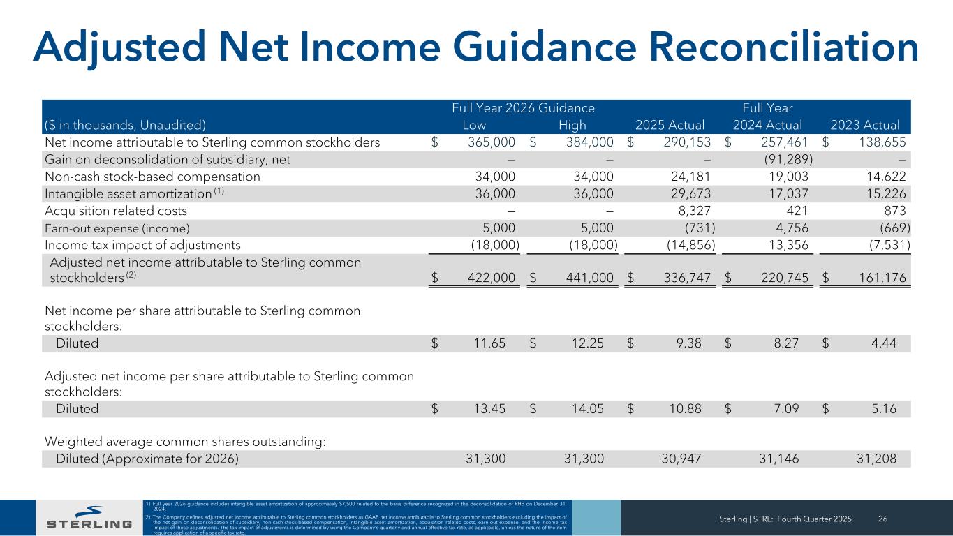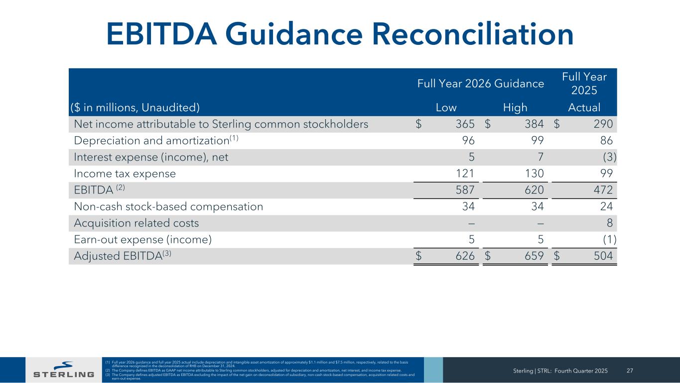 Sterling | STRL: Fourth Quarter 2025 26 (1) Full year 2026 guidance includes intangible asset amortization of approximately $7,500 related to the basis difference recognized in the deconsolidation of RHB on December 31, 2024. (2) The Company defines adjusted net income attributable to Sterling common stockholders as GAAP net income attributable to Sterling common stockholders excluding the impact of the net gain on deconsolidation of subsidiary, non-cash stock-based compensation, intangible asset amortization, acquisition related costs, earn-out expense, and the income tax impact of these adjustments. The tax impact of adjustments is determined by using the Company's quarterly and annual effective tax rate, as applicable, unless the nature of the item requires application of a specific tax rate. Full Year 2026 Guidance Full Year ($ in thousands, Unaudited) Low High 2025 Actual 2024 Actual 2023 Actual Net income attributable to Sterling common stockholders $ 365,000 $ 384,000 $ 290,153 $ 257,461 $ 138,655 Gain on deconsolidation of subsidiary, net — — — (91,289) — Non-cash stock-based compensation 34,000 34,000 24,181 19,003 14,622 Intangible asset amortization (1) 36,000 36,000 29,673 17,037 15,226 Acquisition related costs — — 8,327 421 873 Earn-out expense (income) 5,000 5,000 (731) 4,756 (669) Income tax impact of adjustments (18,000) (18,000) (14,856) 13,356 (7,531) Adjusted net income attributable to Sterling common stockholders (2) $ 422,000 $ 441,000 $ 336,747 $ 220,745 $ 161,176 Net income per share attributable to Sterling common stockholders: Diluted $ 11.65 $ 12.25 $ 9.38 $ 8.27 $ 4.44 Adjusted net income per share attributable to Sterling common stockholders: Diluted $ 13.45 $ 14.05 $ 10.88 $ 7.09 $ 5.16 Weighted average common shares outstanding: Diluted (Approximate for 2026) 31,300 31,300 30,947 31,146 31,208 Adjusted Net Income Guidance Reconciliation