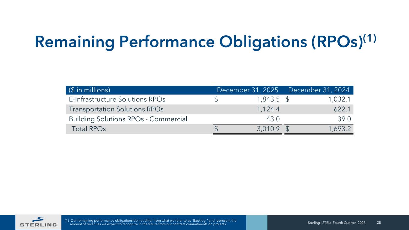 Sterling | STRL: Fourth Quarter 2025 28 Remaining Performance Obligations (RPOs)(1) ($ in millions) December 31, 2025 December 31, 2024 E-Infrastructure Solutions RPOs $ 1,843.5 $ 1,032.1 Transportation Solutions RPOs 1,124.4 622.1 Building Solutions RPOs - Commercial 43.0 39.0 Total RPOs $ 3,010.9 $ 1,693.2 (1) Our remaining performance obligations do not differ from what we refer to as “Backlog,” and represent the amount of revenues we expect to recognize in the future from our contract commitments on projects.