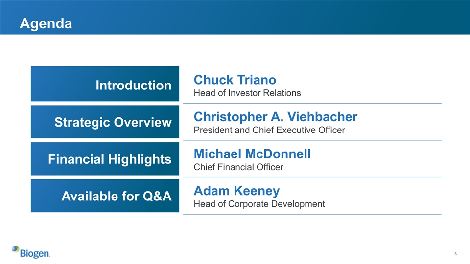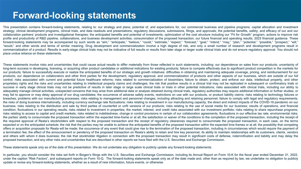 Forward-looking statements This presentation contains forward-looking statements, relating to: our strategy and plans; potential of, and expectations for, our commercial business and pipeline programs; capital allocation and investment strategy; clinical development programs, clinical trials, and data readouts and presentations; regulatory discussions, submissions, filings, and approvals; the potential benefits, safety, and efficacy of our and our collaboration partners’ products and investigational therapies; the anticipated benefits and potential of investments; optimization of the cost structure including our “Fit for Growth” program, actions to improve risk profile and productivity of R&D pipeline, collaborations, and business development activities; consummation of the proposed transaction; our future financial and operating results; 2023 financial guidance. These forward-looking statements may be accompanied by such words as “aim,” “anticipate,” “believe,” “could,” “estimate,” “expect,” “forecast,” “goal,” “intend,” “may,” “plan,” “potential,” “possible,” “prospect,” “will,” “would,” and other words and terms of similar meaning. Drug development and commercialization involve a high degree of risk, and only a small number of research and development programs result in commercialization of a product. Results in early-stage clinical trials may not be indicative of full results or results from later stage or larger scale clinical trials and do not ensure regulatory approval. You should not place undue reliance on these statements. These statements involve risks and uncertainties that could cause actual results to differ materially from those reflected in such statements, including: our dependence on sales from our products; uncertainty of long-term success in developing, licensing, or acquiring other product candidates or additional indications for existing products; failure to compete effectively due to significant product competition in the markets for our products; failure to successfully execute or realize the anticipated benefits of our strategic and growth initiatives; difficulties in obtaining and maintaining adequate coverage, pricing, and reimbursement for our products; our dependence on collaborators and other third parties for the development, regulatory approval, and commercialization of products and other aspects of our business, which are outside of our full control; risks associated with current and potential future healthcare reforms; risks related to commercialization of biosimilars; failure to obtain, protect, and enforce our data, intellectual property, and other proprietary rights and the risks and uncertainties relating to intellectual property claims and challenges; the risk that positive results in a clinical trial may not be replicated in subsequent or confirmatory trials or success in early stage clinical trials may not be predictive of results in later stage or large scale clinical trials or trials in other potential indications; risks associated with clinical trials, including our ability to adequately manage clinical activities, unexpected concerns that may arise from additional data or analysis obtained during clinical trials, regulatory authorities may require additional information or further studies, or may fail to approve or may delay approval of our drug candidates; the occurrence of adverse safety events, restrictions on use with our products, or product liability claims; risks relating to technology failures or breaches; problems with our manufacturing processes; risks relating to management and personnel changes, including attracting and retaining personnel; failure to comply with legal and regulatory requirements; the risks of doing business internationally, including currency exchange rate fluctuations; risks relating to investment in our manufacturing capacity; the direct and indirect impacts of the COVID-19 pandemic on our business; risks relating to the distribution and sale by third parties of counterfeit or unfit versions of our products; risks relating to the use of social media for our business; results of operations, and financial condition; fluctuations in our operating results; risks related to investment in properties; the market, interest, and credit risks associated with our investment portfolio; risks relating to share repurchase programs; risks relating to access to capital and credit markets; risks related to indebtedness; change in control provisions in certain of our collaboration agreements; fluctuations in our effective tax rate; environmental risks; the parties’ ability to consummate the proposed transaction within the expected time-frame or at all; the satisfaction or waiver of the conditions to the completion of the proposed transaction, including the receipt of the required approval of Reata’s stockholders with respect to the proposed transaction and the receipt of regulatory clearances required to consummate the proposed transaction, in each case, on the terms expected or on the anticipated schedule; the risk that the parties may be unable to achieve the anticipated benefits of the proposed transaction within the expected time frames or at all; the possibility that competing offers or acquisition proposals for Reata will be made; the occurrence of any event that could give rise to the termination of the proposed transaction, including in circumstances which would require the payment of a termination fee; the effect of the announcement or pendency of the proposed transaction on Reata’s ability to retain and hire key personnel, its ability to maintain relationships with its customers, clients, vendors and others with whom it does business; the risk that stockholder litigation in connection with the proposed transaction may result in significant costs of defense, indemnification and liability and may delay the proposed transaction; and any other risks