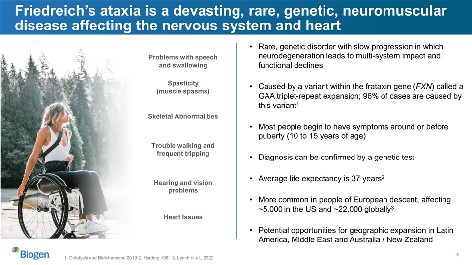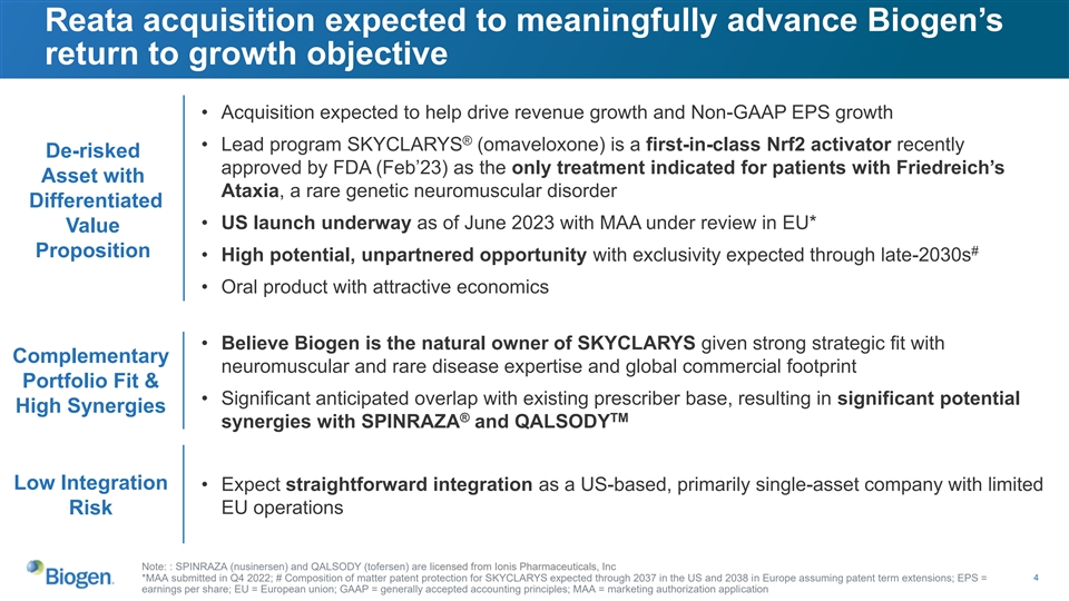 Reata acquisition expected to meaningfully advance Biogen’s return to growth objective • Acquisition expected to help drive revenue growth and Non-GAAP EPS growth ® • Lead program SKYCLARYS (omaveloxone) is a first-in-class Nrf2 activator recently De-risked approved by FDA (Feb’23) as the only treatment indicated for patients with Friedreich’s Asset with Ataxia, a rare genetic neuromuscular disorder Differentiated • US launch underway as of June 2023 with MAA under review in EU* Value # Proposition • High potential, unpartnered opportunity with exclusivity expected through late-2030s • Oral product with attractive economics • Believe Biogen is the natural owner of SKYCLARYS given strong strategic fit with Complementary neuromuscular and rare disease expertise and global commercial footprint Portfolio Fit & • Significant anticipated overlap with existing prescriber base, resulting in significant potential High Synergies ® TM synergies with SPINRAZA and QALSODY Low Integration • Expect straightforward integration as a US-based, primarily single-asset company with limited Risk EU operations Note: : SPINRAZA (nusinersen) and QALSODY (tofersen) are licensed from Ionis Pharmaceuticals, Inc *MAA submitted in Q4 2022; # Composition of matter patent protection for SKYCLARYS expected through 2037 in the US and 2038 in Europe assuming patent term extensions; EPS = 4 4 earnings per share; EU = European union; GAAP = generally accepted accounting principles; MAA = marketing authorization application