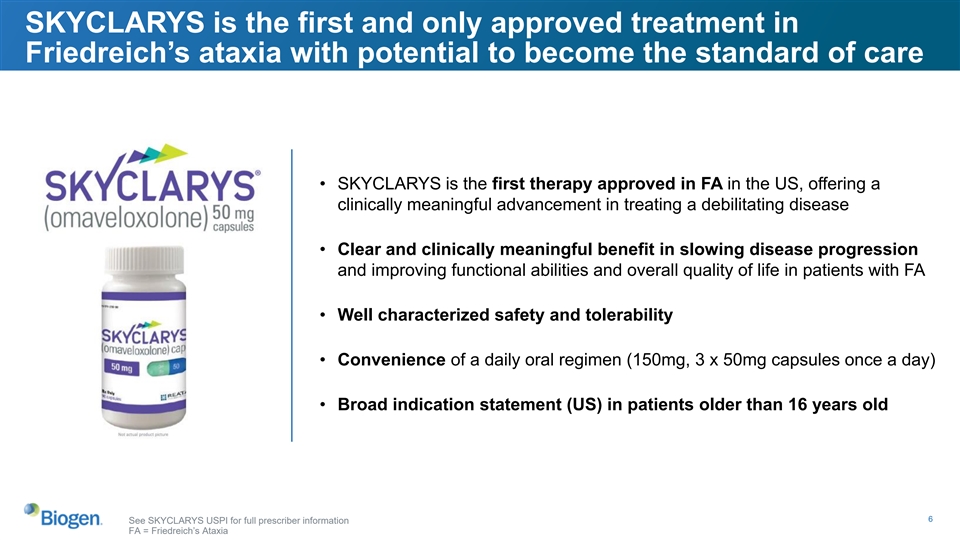 Friedreich’s ataxia is a devasting, rare, genetic, neuromuscular disease affecting the nervous system and heart • Rare, genetic disorder with slow progression in which neurodegeneration leads to multi-system impact and Problems with speech and swallowing functional declines Spasticity • Caused by a variant within the frataxin gene (FXN) called a (muscle spasms) GAA triplet-repeat expansion; 96% of cases are caused by 1 this variant Skeletal Abnormalities • Most people begin to have symptoms around or before puberty (10 to 15 years of age) Trouble walking and frequent tripping • Diagnosis can be confirmed by a genetic test 2 • Average life expectancy is 37 years Hearing and vision problems • More common in people of European descent, affecting 3 ~5,000 in the US and ~22,000 globally Heart Issues • Potential opportunities for geographic expansion in Latin America, Middle East and Australia / New Zealand 5 1. Delatycki and Bidichandani, 2019 2. Harding,1981 3. Lynch et al., 2022 5