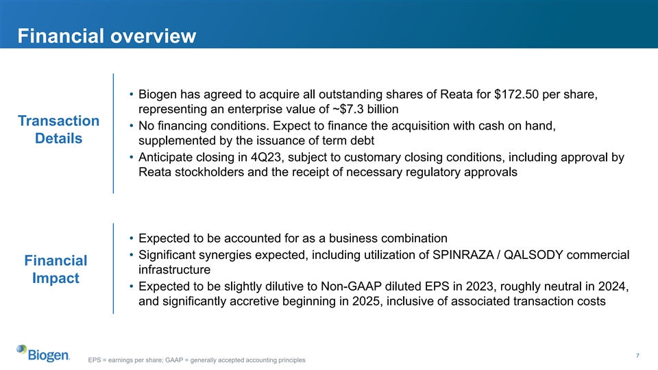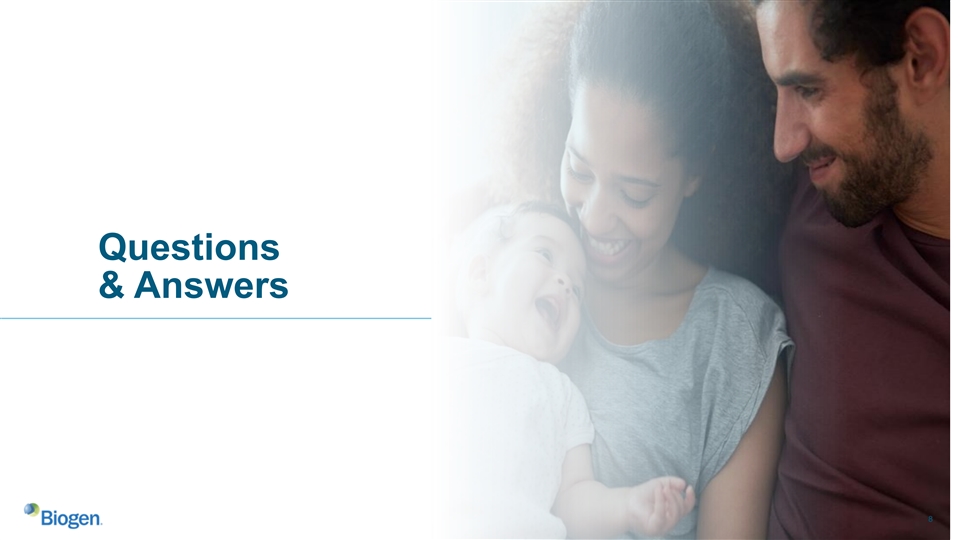 Financial overview • Biogen has agreed to acquire all outstanding shares of Reata for $172.50 per share, representing an enterprise value of ~$7.3 billion Transaction • No financing conditions. Expect to finance the acquisition with cash on hand, Details supplemented by the issuance of term debt • ​Anticipate closing in 4Q23, subject to customary closing conditions, including approval by Reata stockholders and the receipt of necessary regulatory approvals • Expected to be accounted for as a business combination • Significant synergies expected, including utilization of SPINRAZA / QALSODY commercial Financial infrastructure Impact • Expected to be slightly dilutive to Non-GAAP diluted EPS in 2023, roughly neutral in 2024, and significantly accretive beginning in 2025, inclusive of associated transaction costs 7 7 EPS = earnings per share; GAAP = generally accepted accounting principles