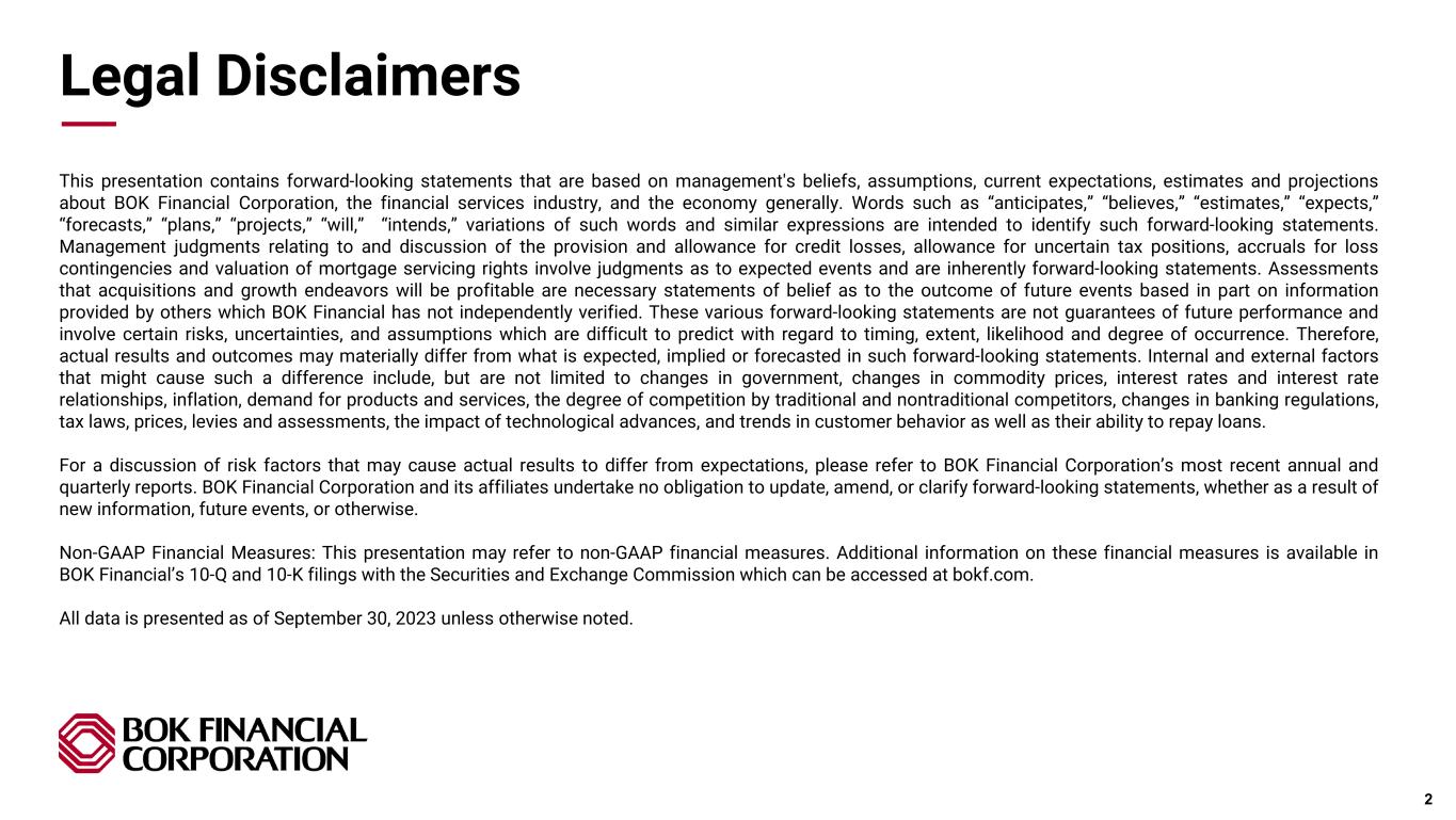 This presentation contains forward-looking statements that are based on management's beliefs, assumptions, current expectations, estimates and projections about BOK Financial Corporation, the financial services industry, and the economy generally. Words such as “anticipates,” “believes,” “estimates,” “expects,” “forecasts,” “plans,” “projects,” “will,” “intends,” variations of such words and similar expressions are intended to identify such forward-looking statements. Management judgments relating to and discussion of the provision and allowance for credit losses, allowance for uncertain tax positions, accruals for loss contingencies and valuation of mortgage servicing rights involve judgments as to expected events and are inherently forward-looking statements. Assessments that acquisitions and growth endeavors will be profitable are necessary statements of belief as to the outcome of future events based in part on information provided by others which BOK Financial has not independently verified. These various forward-looking statements are not guarantees of future performance and involve certain risks, uncertainties, and assumptions which are difficult to predict with regard to timing, extent, likelihood and degree of occurrence. Therefore, actual results and outcomes may materially differ from what is expected, implied or forecasted in such forward-looking statements. Internal and external factors that might cause such a difference include, but are not limited to changes in government, changes in commodity prices, interest rates and interest rate relationships, inflation, demand for products and services, the degree of competition by traditional and nontraditional competitors, changes in banking regulations, tax laws, prices, levies and assessments, the impact of technological advances, and trends in customer behavior as well as their ability to repay loans. For a discussion of risk factors that may cause actual results to differ from expectations, please refer to BOK Financial Corporation’s most recent annual and quarterly reports. BOK Financial Corporation and its affiliates undertake no obligation to update, amend, or clarify forward-looking statements, whether as a result of new information, future events, or otherwise. Non-GAAP Financial Measures: This presentation may refer to non-GAAP financial measures. Additional information on these financial measures is available in BOK Financial’s 10-Q and 10-K filings with the Securities and Exchange Commission which can be accessed at bokf.com. All data is presented as of September 30, 2023 unless otherwise noted. Legal Disclaimers 2