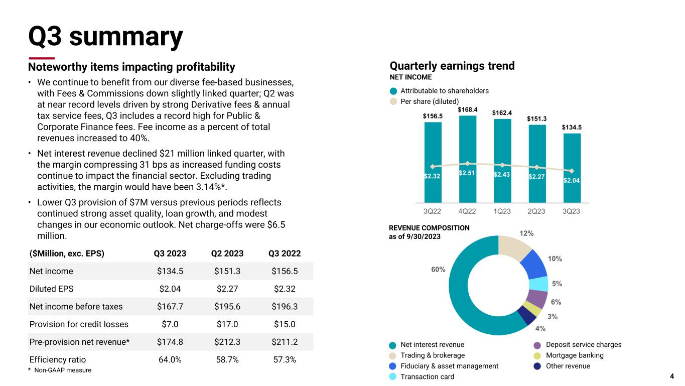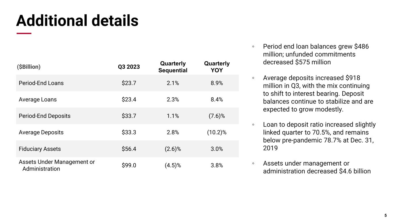 Q3 summary * Non-GAAP measure Attributable to shareholders Per share (diluted) Quarterly earnings trend NET INCOME Noteworthy items impacting profitability • We continue to benefit from our diverse fee-based businesses, with Fees & Commissions down slightly linked quarter; Q2 was at near record levels driven by strong Derivative fees & annual tax service fees, Q3 includes a record high for Public & Corporate Finance fees. Fee income as a percent of total revenues increased to 40%. • Net interest revenue declined $21 million linked quarter, with the margin compressing 31 bps as increased funding costs continue to impact the financial sector. Excluding trading activities, the margin would have been 3.14%*. • Lower Q3 provision of $7M versus previous periods reflects continued strong asset quality, loan growth, and modest changes in our economic outlook. Net charge-offs were $6.5 million. 4 ($Million, exc. EPS) Q3 2023 Q2 2023 Q3 2022 Net income $134.5 $151.3 $156.5 Diluted EPS $2.04 $2.27 $2.32 Net income before taxes $167.7 $195.6 $196.3 Provision for credit losses $7.0 $17.0 $15.0 Pre-provision net revenue* $174.8 $212.3 $211.2 Efficiency ratio 64.0% 58.7% 57.3% REVENUE COMPOSITION as of 9/30/2023 Net interest revenue Trading & brokerage Fiduciary & asset management Transaction card Deposit service charges Mortgage banking Other revenue