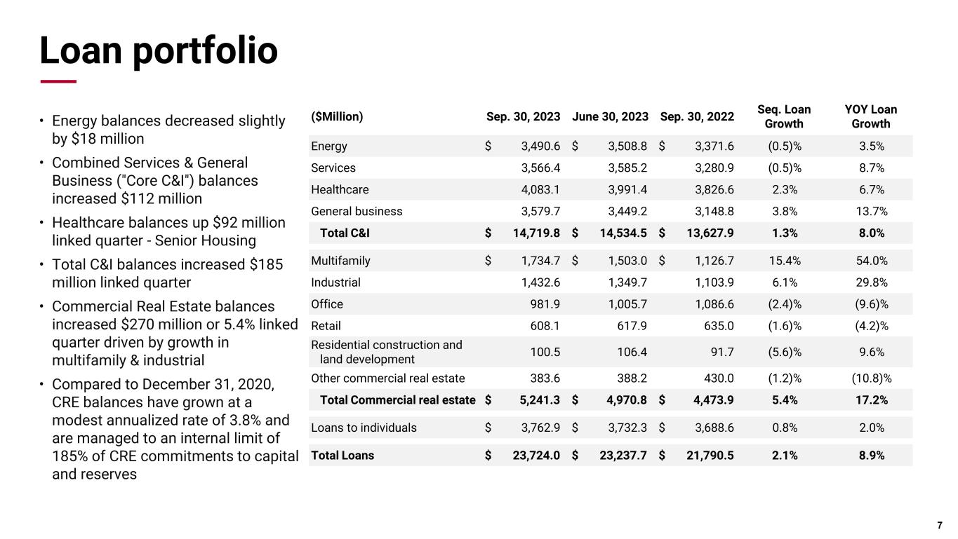 Additional details 5 ◦ Period end loan balances grew $486 million; unfunded commitments decreased $575 million ◦ Average deposits increased $918 million in Q3, with the mix continuing to shift to interest bearing. Deposit balances continue to stabilize and are expected to grow modestly. ◦ Loan to deposit ratio increased slightly linked quarter to 70.5%, and remains below pre-pandemic 78.7% at Dec. 31, 2019 ◦ Assets under management or administration decreased $4.6 billion ($Billion) Q3 2023 Quarterly Sequential Quarterly YOY Period-End Loans $23.7 2.1% 8.9% Average Loans $23.4 2.3% 8.4% Period-End Deposits $33.7 1.1% (7.6)% Average Deposits $33.3 2.8% (10.2)% Fiduciary Assets $56.4 (2.6)% 3.0% Assets Under Management or Administration $99.0 (4.5)% 3.8%