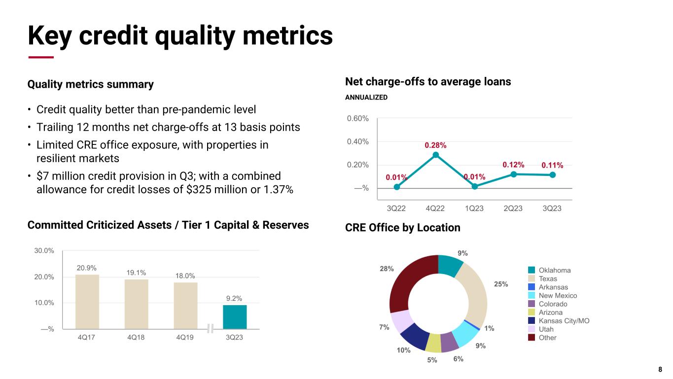 Loan portfolio • Energy balances decreased slightly by $18 million • Combined Services & General Business ("Core C&I") balances increased $112 million • Healthcare balances up $92 million linked quarter - Senior Housing • Total C&I balances increased $185 million linked quarter • Commercial Real Estate balances increased $270 million or 5.4% linked quarter driven by growth in multifamily & industrial • Compared to December 31, 2020, CRE balances have grown at a modest annualized rate of 3.8% and are managed to an internal limit of 185% of CRE commitments to capital and reserves 7 ($Million) Sep. 30, 2023 June 30, 2023 Sep. 30, 2022 Seq. Loan Growth YOY Loan Growth Energy $ 3,490.6 $ 3,508.8 $ 3,371.6 (0.5)% 3.5% Services 3,566.4 3,585.2 3,280.9 (0.5)% 8.7% Healthcare 4,083.1 3,991.4 3,826.6 2.3% 6.7% General business 3,579.7 3,449.2 3,148.8 3.8% 13.7% Total C&I $ 14,719.8 $ 14,534.5 $ 13,627.9 1.3% 8.0% Multifamily $ 1,734.7 $ 1,503.0 $ 1,126.7 15.4% 54.0% Industrial 1,432.6 1,349.7 1,103.9 6.1% 29.8% Office 981.9 1,005.7 1,086.6 (2.4)% (9.6)% Retail 608.1 617.9 635.0 (1.6)% (4.2)% Residential construction and land development 100.5 106.4 91.7 (5.6)% 9.6% Other commercial real estate 383.6 388.2 430.0 (1.2)% (10.8)% Total Commercial real estate $ 5,241.3 $ 4,970.8 $ 4,473.9 5.4% 17.2% Loans to individuals $ 3,762.9 $ 3,732.3 $ 3,688.6 0.8% 2.0% Total Loans $ 23,724.0 $ 23,237.7 $ 21,790.5 2.1% 8.9%