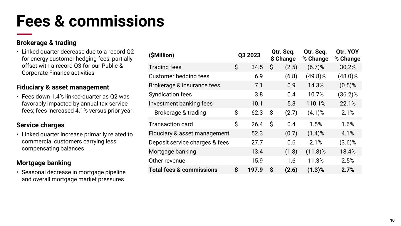 Fees & commissions Brokerage & trading • Linked quarter decrease due to a record Q2 for energy customer hedging fees, partially offset with a record Q3 for our Public & Corporate Finance activities Fiduciary & asset management • Fees down 1.4% linked-quarter as Q2 was favorably impacted by annual tax service fees; fees increased 4.1% versus prior year. Service charges • Linked quarter increase primarily related to commercial customers carrying less compensating balances Mortgage banking • Seasonal decrease in mortgage pipeline and overall mortgage market pressures 10 ($Million) Q3 2023 Qtr. Seq. $ Change Qtr. Seq. % Change Qtr. YOY % Change Trading fees $ 34.5 $ (2.5) (6.7)% 30.2% Customer hedging fees 6.9 (6.8) (49.8)% (48.0)% Brokerage & insurance fees 7.1 0.9 14.3% (0.5)% Syndication fees 3.8 0.4 10.7% (36.2)% Investment banking fees 10.1 5.3 110.1% 22.1% Brokerage & trading $ 62.3 $ (2.7) (4.1)% 2.1% Transaction card $ 26.4 $ 0.4 1.5% 1.6% Fiduciary & asset management 52.3 (0.7) (1.4)% 4.1% Deposit service charges & fees 27.7 0.6 2.1% (3.6)% Mortgage banking 13.4 (1.8) (11.8)% 18.4% Other revenue 15.9 1.6 11.3% 2.5% Total fees & commissions $ 197.9 $ (2.6) (1.3)% 2.7%