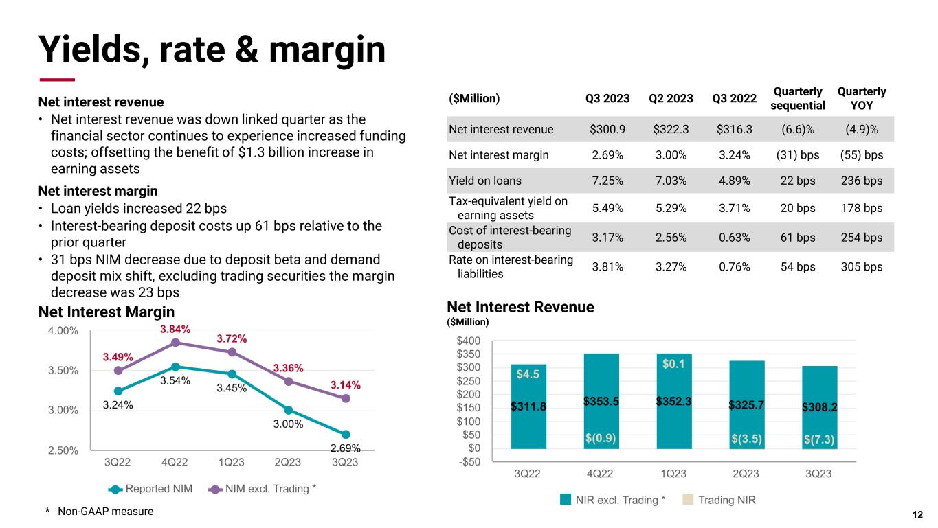 Yields, rate & margin Net interest revenue • Net interest revenue was down linked quarter as the financial sector continues to experience increased funding costs; offsetting the benefit of $1.3 billion increase in earning assets Net interest margin • Loan yields increased 22 bps • Interest-bearing deposit costs up 61 bps relative to the prior quarter • 31 bps NIM decrease due to deposit beta and demand deposit mix shift, excluding trading securities the margin decrease was 23 bps 12 ($Million) Q3 2023 Q2 2023 Q3 2022 Quarterly sequential Quarterly YOY Net interest revenue $300.9 $322.3 $316.3 (6.6)% (4.9)% Net interest margin 2.69% 3.00% 3.24% (31) bps (55) bps Yield on loans 7.25% 7.03% 4.89% 22 bps 236 bps Tax-equivalent yield on earning assets 5.49% 5.29% 3.71% 20 bps 178 bps Cost of interest-bearing deposits 3.17% 2.56% 0.63% 61 bps 254 bps Rate on interest-bearing liabilities 3.81% 3.27% 0.76% 54 bps 305 bps Net Interest Revenue ($Million) Net Interest Margin * Non-GAAP measure