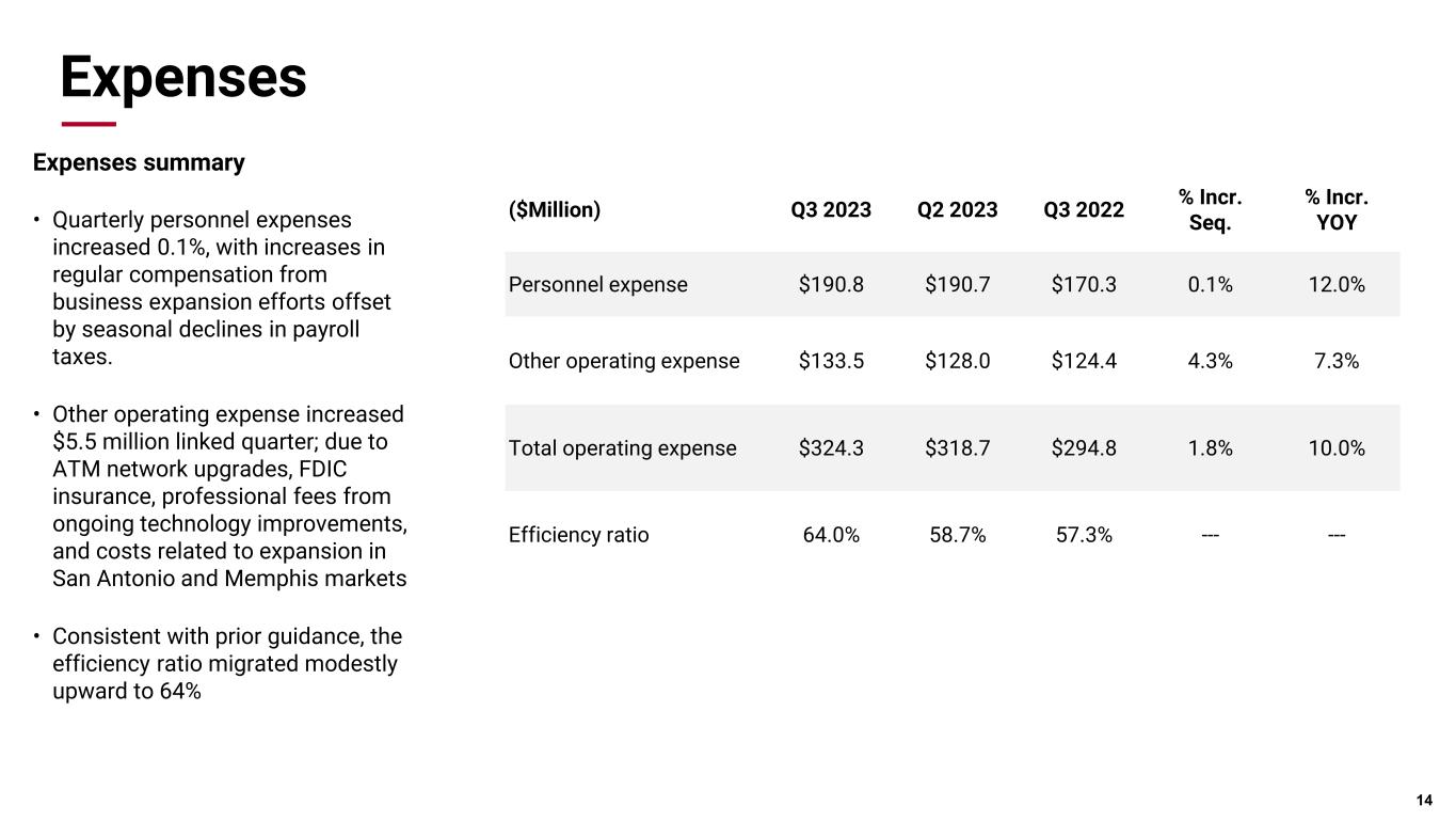 Liquidity & capital * Non-GAAP measure • Period-end deposit balances increased $358 million this quarter • Potential secured capacity was $23.0 billion, which reflects current available secured capacity of $18.7 billion increased by $4.3 billion as an estimate of other sources that could be converted into additional secured capacity • Uninsured deposit balances excluding collateralized and consolidated subsidiary balances were $13.7 million, with BOKF's coverage ratio remaining stable at ~ 168% • Robust capital ratios consistently remain well above regulatory and internal policy thresholds • CET1 including AOCI 9.7%* and both AOCI and HTM 9.2%* • TCE including HTM 7.35%* ◦ For Q2, 3rd highest among top 20 banks • Repurchased 700,500 shares at an average price of $84.17 per share in the open market 13 Q3 2023 Q2 2023 Q3 2022 Loan to Deposit Ratio 70.5% 69.8% 59.8% Period-End Deposits $33.7 billion $33.3 billion $36.4 billion Current available secured capacity $18.7 billion $19.2 billion $15.7 billion Common Equity Tier 1 12.1% 12.1% 11.8% Total Capital Ratio 13.2% 13.2% 12.8% Tangible Common Equity Ratio * 7.7% 7.8% 8.0% Coverage Ratio ~168% Uninsured Deposit Coverage ($Billions)
