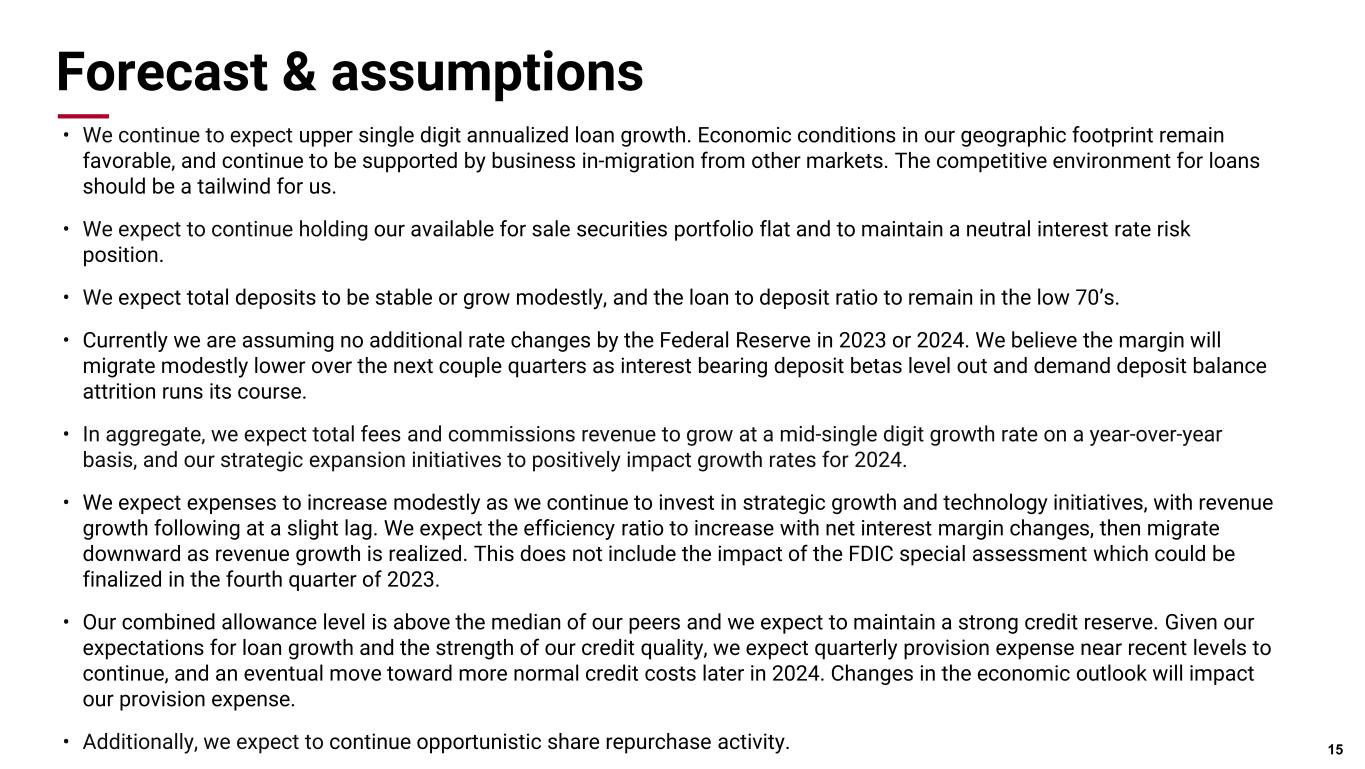 Expenses Expenses summary • Quarterly personnel expenses increased 0.1%, with increases in regular compensation from business expansion efforts offset by seasonal declines in payroll taxes. • Other operating expense increased $5.5 million linked quarter; due to ATM network upgrades, FDIC insurance, professional fees from ongoing technology improvements, and costs related to expansion in San Antonio and Memphis markets • Consistent with prior guidance, the efficiency ratio migrated modestly upward to 64% 14 ($Million) Q3 2023 Q2 2023 Q3 2022 % Incr. Seq. % Incr. YOY Personnel expense $190.8 $190.7 $170.3 0.1% 12.0% Other operating expense $133.5 $128.0 $124.4 4.3% 7.3% Total operating expense $324.3 $318.7 $294.8 1.8% 10.0% Efficiency ratio 64.0% 58.7% 57.3% --- ---