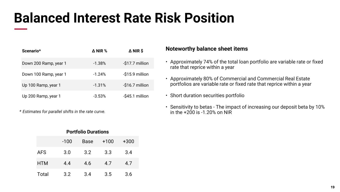 Balanced Interest Rate Risk Position Noteworthy balance sheet items • Approximately 74% of the total loan portfolio are variable rate or fixed rate that reprice within a year • Approximately 80% of Commercial and Commercial Real Estate portfolios are variable rate or fixed rate that reprice within a year • Short duration securities portfolio • Sensitivity to betas - The impact of increasing our deposit beta by 10% in the +200 is -1.20% on NIR 19 Scenario* ∆ NIR % ∆ NIR $ Down 200 Ramp, year 1 -1.38% -$17.7 million Down 100 Ramp, year 1 -1.24% -$15.9 million Up 100 Ramp, year 1 -1.31% -$16.7 million Up 200 Ramp, year 1 -3.53% -$45.1 million * Estimates for parallel shifts in the rate curve. Portfolio Durations -100 Base +100 +300 AFS 3.0 3.2 3.3 3.4 HTM 4.4 4.6 4.7 4.7 Total 3.2 3.4 3.5 3.6