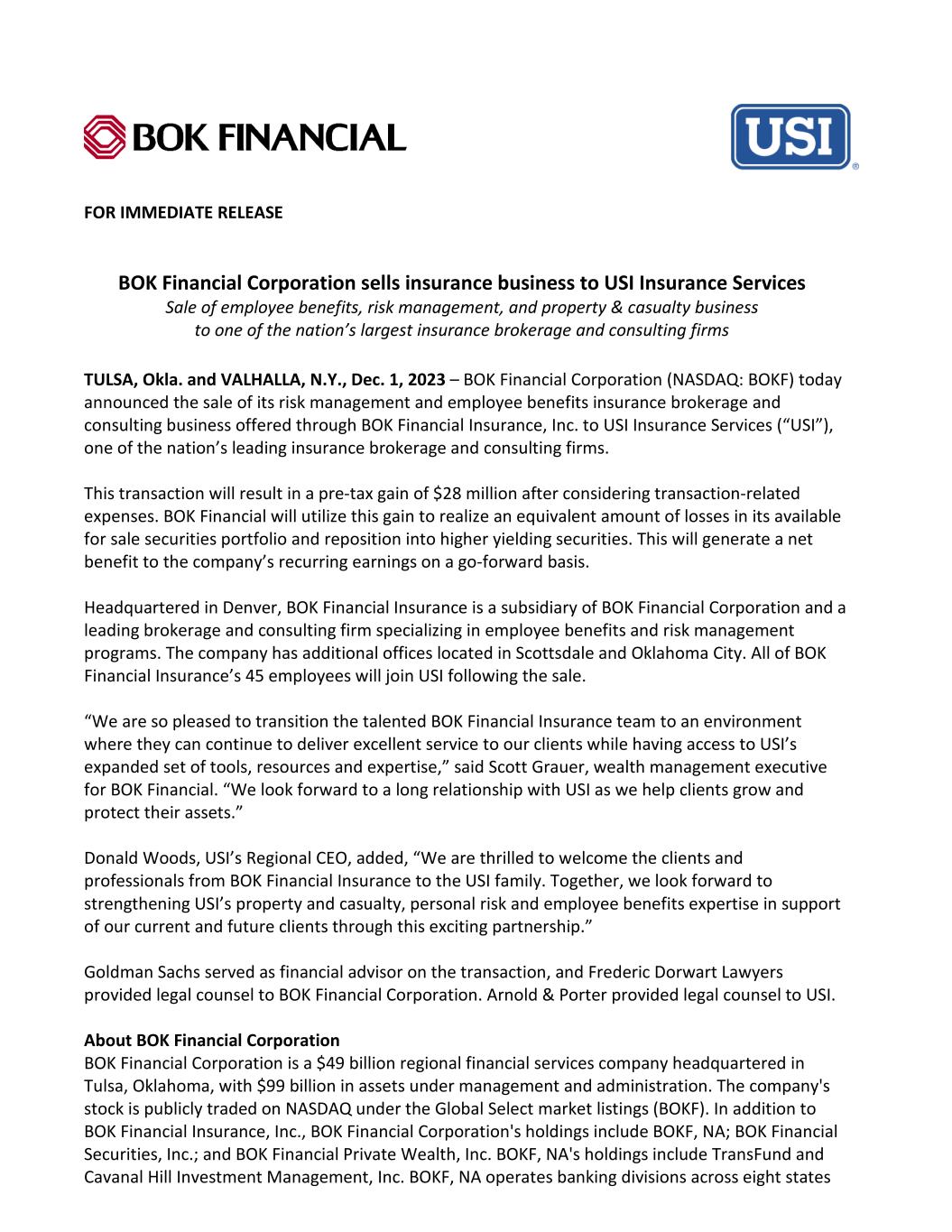 FOR IMMEDIATE RELEASE BOK Financial Corporation sells insurance business to USI Insurance Services Sale of employee benefits, risk management, and property & casualty business to one of the nation’s largest insurance brokerage and consulting firms TULSA, Okla. and VALHALLA, N.Y., Dec. 1, 2023 – BOK Financial Corporation (NASDAQ: BOKF) today announced the sale of its risk management and employee benefits insurance brokerage and consulting business offered through BOK Financial Insurance, Inc. to USI Insurance Services (“USI”), one of the nation’s leading insurance brokerage and consulting firms. This transaction will result in a pre-tax gain of $28 million after considering transaction-related expenses. BOK Financial will utilize this gain to realize an equivalent amount of losses in its available for sale securities portfolio and reposition into higher yielding securities. This will generate a net benefit to the company’s recurring earnings on a go-forward basis. Headquartered in Denver, BOK Financial Insurance is a subsidiary of BOK Financial Corporation and a leading brokerage and consulting firm specializing in employee benefits and risk management programs. The company has additional offices located in Scottsdale and Oklahoma City. All of BOK Financial Insurance’s 45 employees will join USI following the sale. “We are so pleased to transition the talented BOK Financial Insurance team to an environment where they can continue to deliver excellent service to our clients while having access to USI’s expanded set of tools, resources and expertise,” said Scott Grauer, wealth management executive for BOK Financial. “We look forward to a long relationship with USI as we help clients grow and protect their assets.” Donald Woods, USI’s Regional CEO, added, “We are thrilled to welcome the clients and professionals from BOK Financial Insurance to the USI family. Together, we look forward to strengthening USI’s property and casualty, personal risk and employee benefits expertise in support of our current and future clients through this exciting partnership.” Goldman Sachs served as financial advisor on the transaction, and Frederic Dorwart Lawyers provided legal counsel to BOK Financial Corporation. Arnold & Porter provided legal counsel to USI. About BOK Financial Corporation BOK Financial Corporation is a $49 billion regional financial services company headquartered in Tulsa, Oklahoma, with $99 billion in assets under management and administration. The company's stock is publicly traded on NASDAQ under the Global Select market listings (BOKF). In addition to BOK Financial Insurance, Inc., BOK Financial Corporation's holdings include BOKF, NA; BOK Financial Securities, Inc.; and BOK Financial Private Wealth, Inc. BOKF, NA's holdings include TransFund and Cavanal Hill Investment Management, Inc. BOKF, NA operates banking divisions across eight states