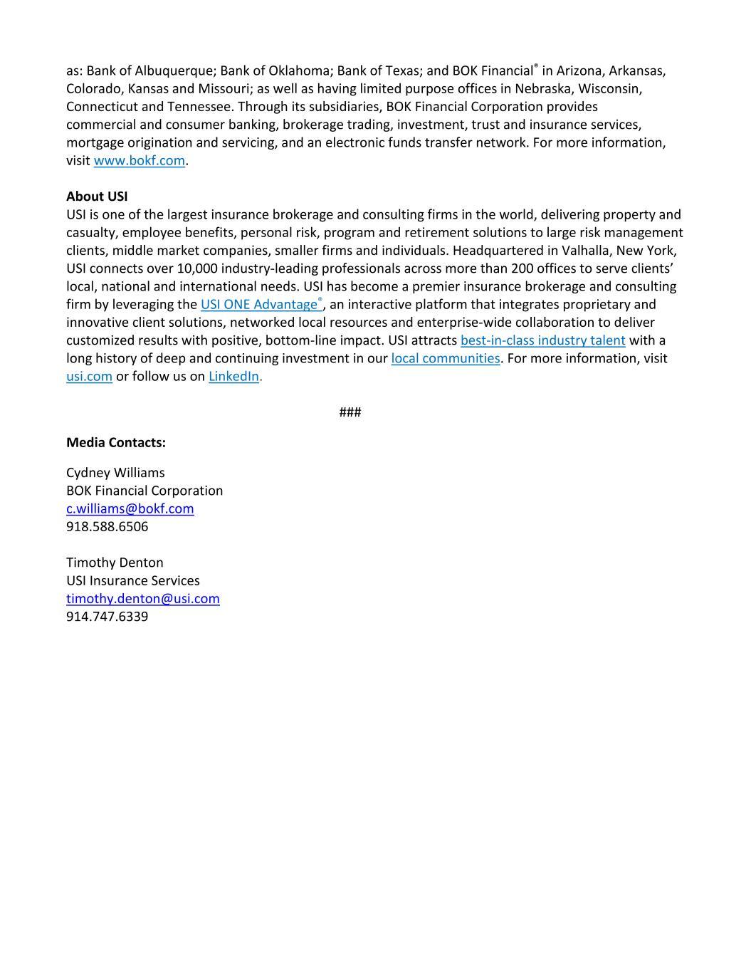 as: Bank of Albuquerque; Bank of Oklahoma; Bank of Texas; and BOK Financial® in Arizona, Arkansas, Colorado, Kansas and Missouri; as well as having limited purpose offices in Nebraska, Wisconsin, Connecticut and Tennessee. Through its subsidiaries, BOK Financial Corporation provides commercial and consumer banking, brokerage trading, investment, trust and insurance services, mortgage origination and servicing, and an electronic funds transfer network. For more information, visit www.bokf.com. About USI USI is one of the largest insurance brokerage and consulting firms in the world, delivering property and casualty, employee benefits, personal risk, program and retirement solutions to large risk management clients, middle market companies, smaller firms and individuals. Headquartered in Valhalla, New York, USI connects over 10,000 industry-leading professionals across more than 200 offices to serve clients’ local, national and international needs. USI has become a premier insurance brokerage and consulting firm by leveraging the USI ONE Advantage®, an interactive platform that integrates proprietary and innovative client solutions, networked local resources and enterprise-wide collaboration to deliver customized results with positive, bottom-line impact. USI attracts best-in-class industry talent with a long history of deep and continuing investment in our local communities. For more information, visit usi.com or follow us on LinkedIn. ### Media Contacts: Cydney Williams BOK Financial Corporation c.williams@bokf.com 918.588.6506 Timothy Denton USI Insurance Services timothy.denton@usi.com 914.747.6339