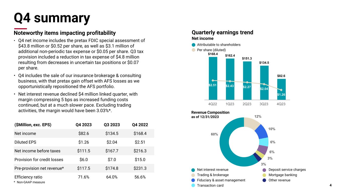 Q4 summary * Non-GAAP measure Attributable to shareholders Per share (diluted) Quarterly earnings trend Net income Noteworthy items impacting profitability • Q4 net income includes the pretax FDIC special assessment of $43.8 million or $0.52 per share, as well as $3.1 million of additional non-periodic tax expense or $0.05 per share. Q3 tax provision included a reduction in tax expense of $4.8 million resulting from decreases in uncertain tax positions or $0.07 per share. • Q4 includes the sale of our insurance brokerage & consulting business, with that pretax gain offset with AFS losses as we opportunistically repositioned the AFS portfolio. • Net interest revenue declined $4 million linked quarter, with margin compressing 5 bps as increased funding costs continued, but at a much slower pace. Excluding trading activities, the margin would have been 3.03%*. 4 ($Million, exc. EPS) Q4 2023 Q3 2023 Q4 2022 Net income $82.6 $134.5 $168.4 Diluted EPS $1.26 $2.04 $2.51 Net income before taxes $111.5 $167.7 $216.3 Provision for credit losses $6.0 $7.0 $15.0 Pre-provision net revenue* $117.5 $174.8 $231.3 Efficiency ratio 71.6% 64.0% 56.6% Revenue Composition as of 12/31/2023 Net interest revenue Trading & brokerage Fiduciary & asset management Transaction card Deposit service charges Mortgage banking Other revenue