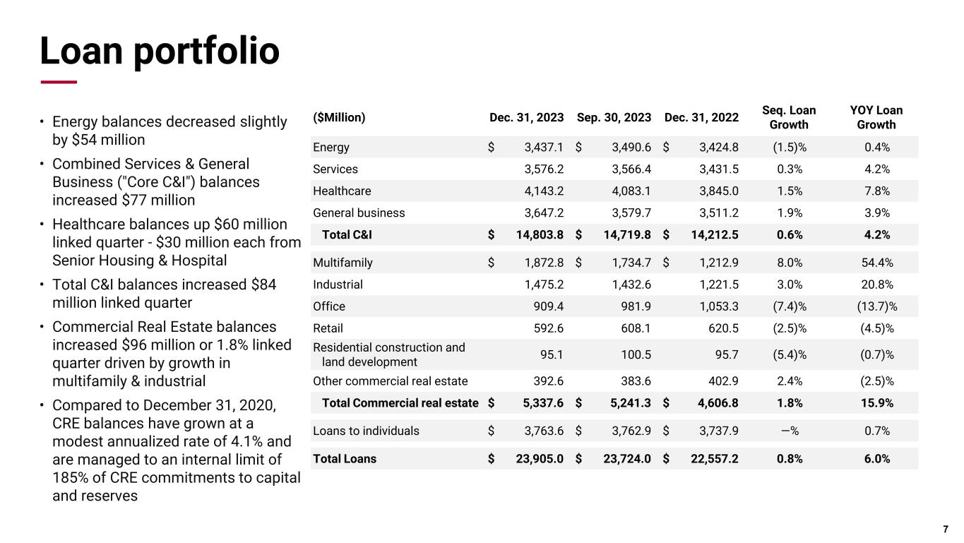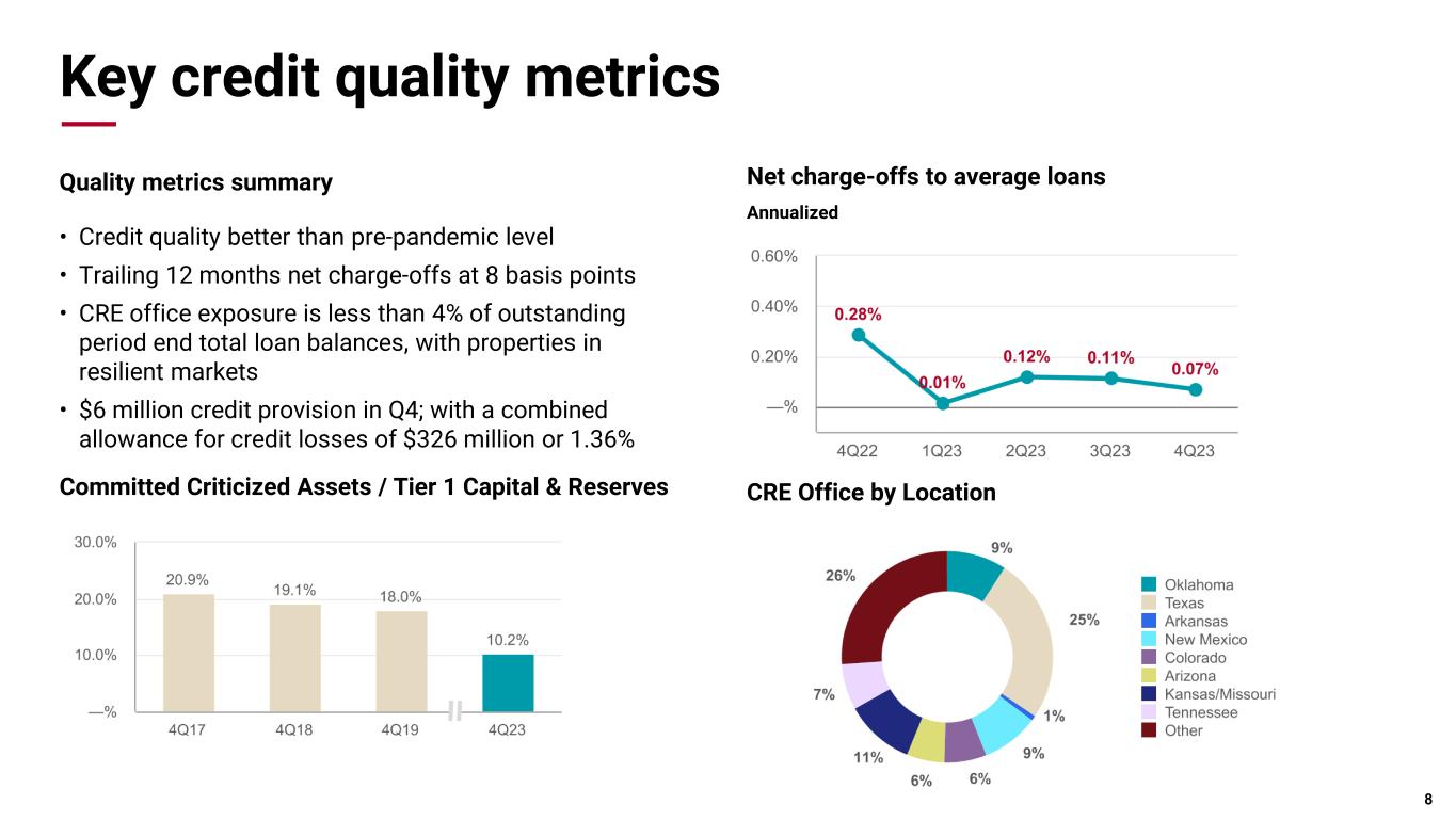 Loan portfolio • Energy balances decreased slightly by $54 million • Combined Services & General Business ("Core C&I") balances increased $77 million • Healthcare balances up $60 million linked quarter - $30 million each from Senior Housing & Hospital • Total C&I balances increased $84 million linked quarter • Commercial Real Estate balances increased $96 million or 1.8% linked quarter driven by growth in multifamily & industrial • Compared to December 31, 2020, CRE balances have grown at a modest annualized rate of 4.1% and are managed to an internal limit of 185% of CRE commitments to capital and reserves 7 ($Million) Dec. 31, 2023 Sep. 30, 2023 Dec. 31, 2022 Seq. Loan Growth YOY Loan Growth Energy $ 3,437.1 $ 3,490.6 $ 3,424.8 (1.5)% 0.4% Services 3,576.2 3,566.4 3,431.5 0.3% 4.2% Healthcare 4,143.2 4,083.1 3,845.0 1.5% 7.8% General business 3,647.2 3,579.7 3,511.2 1.9% 3.9% Total C&I $ 14,803.8 $ 14,719.8 $ 14,212.5 0.6% 4.2% Multifamily $ 1,872.8 $ 1,734.7 $ 1,212.9 8.0% 54.4% Industrial 1,475.2 1,432.6 1,221.5 3.0% 20.8% Office 909.4 981.9 1,053.3 (7.4)% (13.7)% Retail 592.6 608.1 620.5 (2.5)% (4.5)% Residential construction and land development 95.1 100.5 95.7 (5.4)% (0.7)% Other commercial real estate 392.6 383.6 402.9 2.4% (2.5)% Total Commercial real estate $ 5,337.6 $ 5,241.3 $ 4,606.8 1.8% 15.9% Loans to individuals $ 3,763.6 $ 3,762.9 $ 3,737.9 —% 0.7% Total Loans $ 23,905.0 $ 23,724.0 $ 22,557.2 0.8% 6.0%