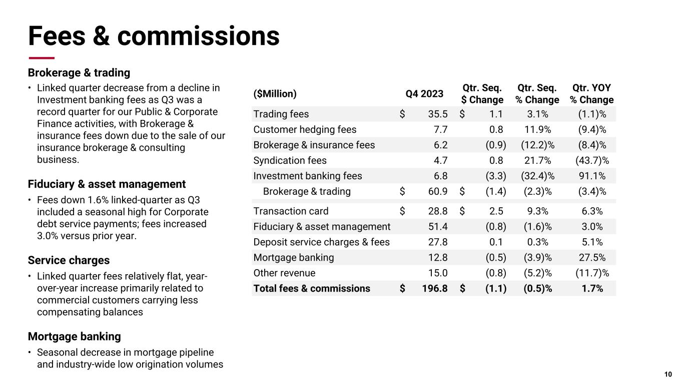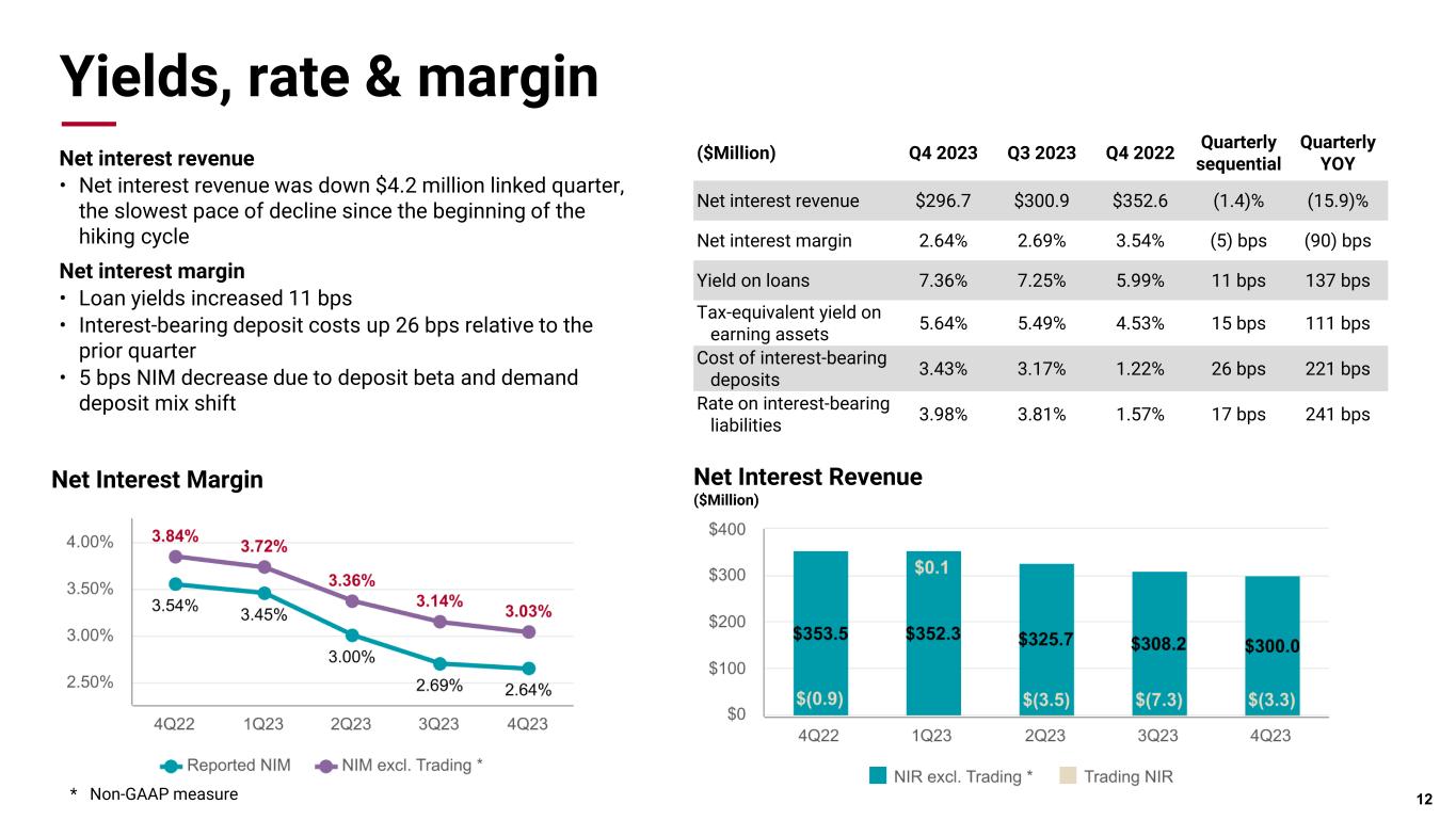 Fees & commissions Brokerage & trading • Linked quarter decrease from a decline in Investment banking fees as Q3 was a record quarter for our Public & Corporate Finance activities, with Brokerage & insurance fees down due to the sale of our insurance brokerage & consulting business. Fiduciary & asset management • Fees down 1.6% linked-quarter as Q3 included a seasonal high for Corporate debt service payments; fees increased 3.0% versus prior year. Service charges • Linked quarter fees relatively flat, year- over-year increase primarily related to commercial customers carrying less compensating balances Mortgage banking • Seasonal decrease in mortgage pipeline and industry-wide low origination volumes 10 ($Million) Q4 2023 Qtr. Seq. $ Change Qtr. Seq. % Change Qtr. YOY % Change Trading fees $ 35.5 $ 1.1 3.1% (1.1)% Customer hedging fees 7.7 0.8 11.9% (9.4)% Brokerage & insurance fees 6.2 (0.9) (12.2)% (8.4)% Syndication fees 4.7 0.8 21.7% (43.7)% Investment banking fees 6.8 (3.3) (32.4)% 91.1% Brokerage & trading $ 60.9 $ (1.4) (2.3)% (3.4)% Transaction card $ 28.8 $ 2.5 9.3% 6.3% Fiduciary & asset management 51.4 (0.8) (1.6)% 3.0% Deposit service charges & fees 27.8 0.1 0.3% 5.1% Mortgage banking 12.8 (0.5) (3.9)% 27.5% Other revenue 15.0 (0.8) (5.2)% (11.7)% Total fees & commissions $ 196.8 $ (1.1) (0.5)% 1.7%