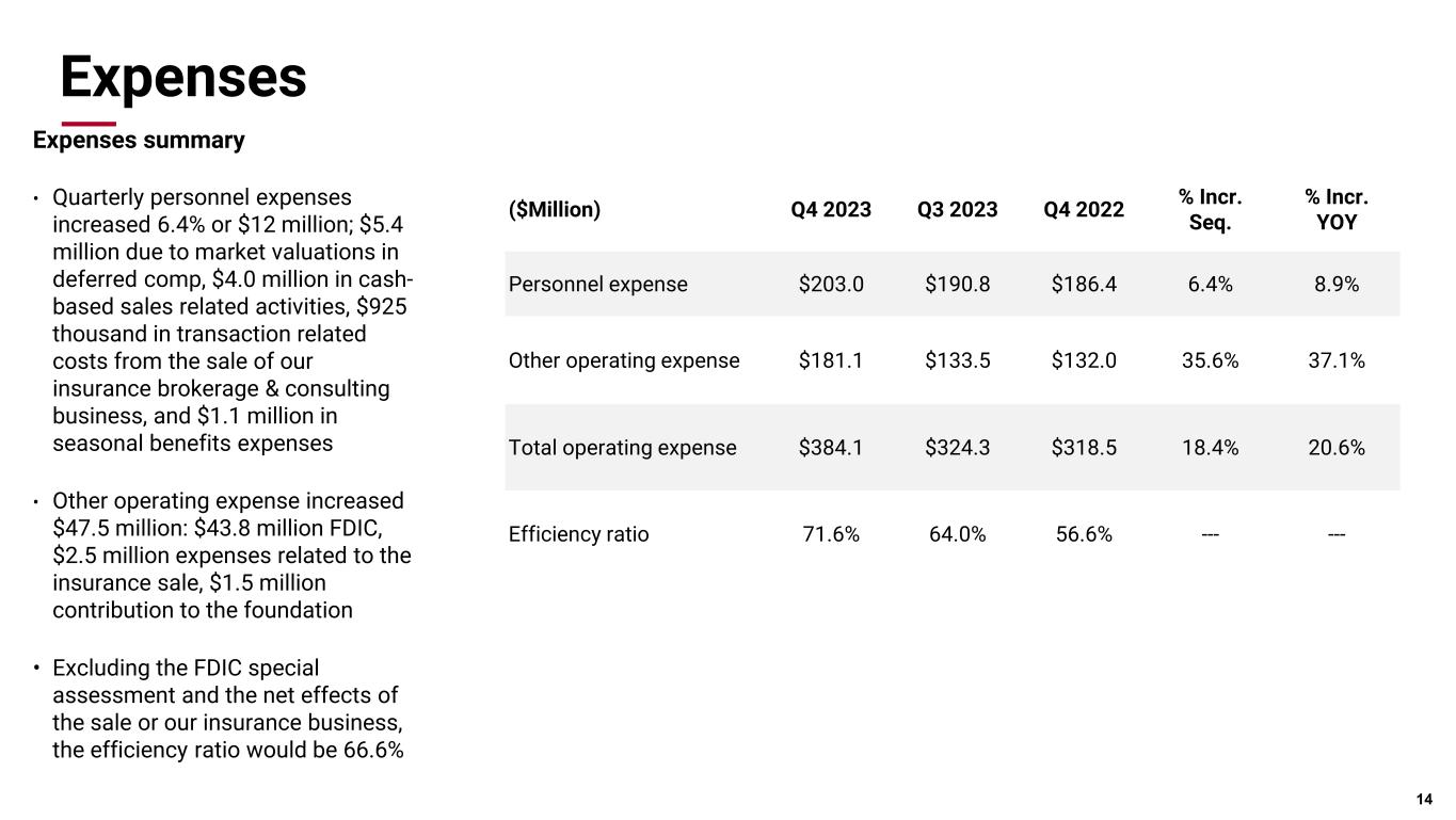 Yields, rate & margin Net interest revenue • Net interest revenue was down $4.2 million linked quarter, the slowest pace of decline since the beginning of the hiking cycle Net interest margin • Loan yields increased 11 bps • Interest-bearing deposit costs up 26 bps relative to the prior quarter • 5 bps NIM decrease due to deposit beta and demand deposit mix shift 12 ($Million) Q4 2023 Q3 2023 Q4 2022 Quarterly sequential Quarterly YOY Net interest revenue $296.7 $300.9 $352.6 (1.4)% (15.9)% Net interest margin 2.64% 2.69% 3.54% (5) bps (90) bps Yield on loans 7.36% 7.25% 5.99% 11 bps 137 bps Tax-equivalent yield on earning assets 5.64% 5.49% 4.53% 15 bps 111 bps Cost of interest-bearing deposits 3.43% 3.17% 1.22% 26 bps 221 bps Rate on interest-bearing liabilities 3.98% 3.81% 1.57% 17 bps 241 bps Net Interest Revenue ($Million) Net Interest Margin * Non-GAAP measure