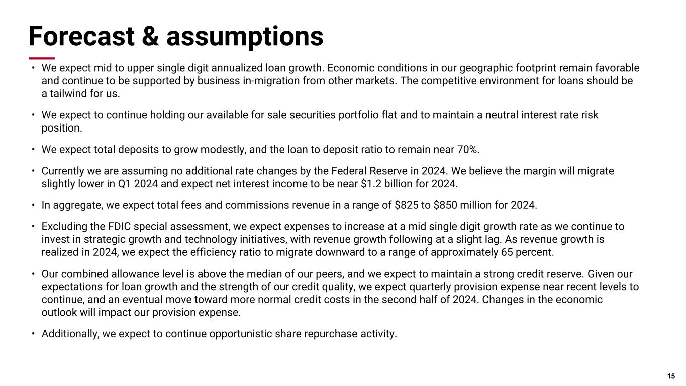 Forecast & assumptions 15 • We expect mid to upper single digit annualized loan growth. Economic conditions in our geographic footprint remain favorable and continue to be supported by business in-migration from other markets. The competitive environment for loans should be a tailwind for us. • We expect to continue holding our available for sale securities portfolio flat and to maintain a neutral interest rate risk position. • We expect total deposits to grow modestly, and the loan to deposit ratio to remain near 70%. • Currently we are assuming no additional rate changes by the Federal Reserve in 2024. We believe the margin will migrate slightly lower in Q1 2024 and expect net interest income to be near $1.2 billion for 2024. • In aggregate, we expect total fees and commissions revenue in a range of $825 to $850 million for 2024. • Excluding the FDIC special assessment, we expect expenses to increase at a mid single digit growth rate as we continue to invest in strategic growth and technology initiatives, with revenue growth following at a slight lag. As revenue growth is realized in 2024, we expect the efficiency ratio to migrate downward to a range of approximately 65 percent. • Our combined allowance level is above the median of our peers, and we expect to maintain a strong credit reserve. Given our expectations for loan growth and the strength of our credit quality, we expect quarterly provision expense near recent levels to continue, and an eventual move toward more normal credit costs in the second half of 2024. Changes in the economic outlook will impact our provision expense. • Additionally, we expect to continue opportunistic share repurchase activity.