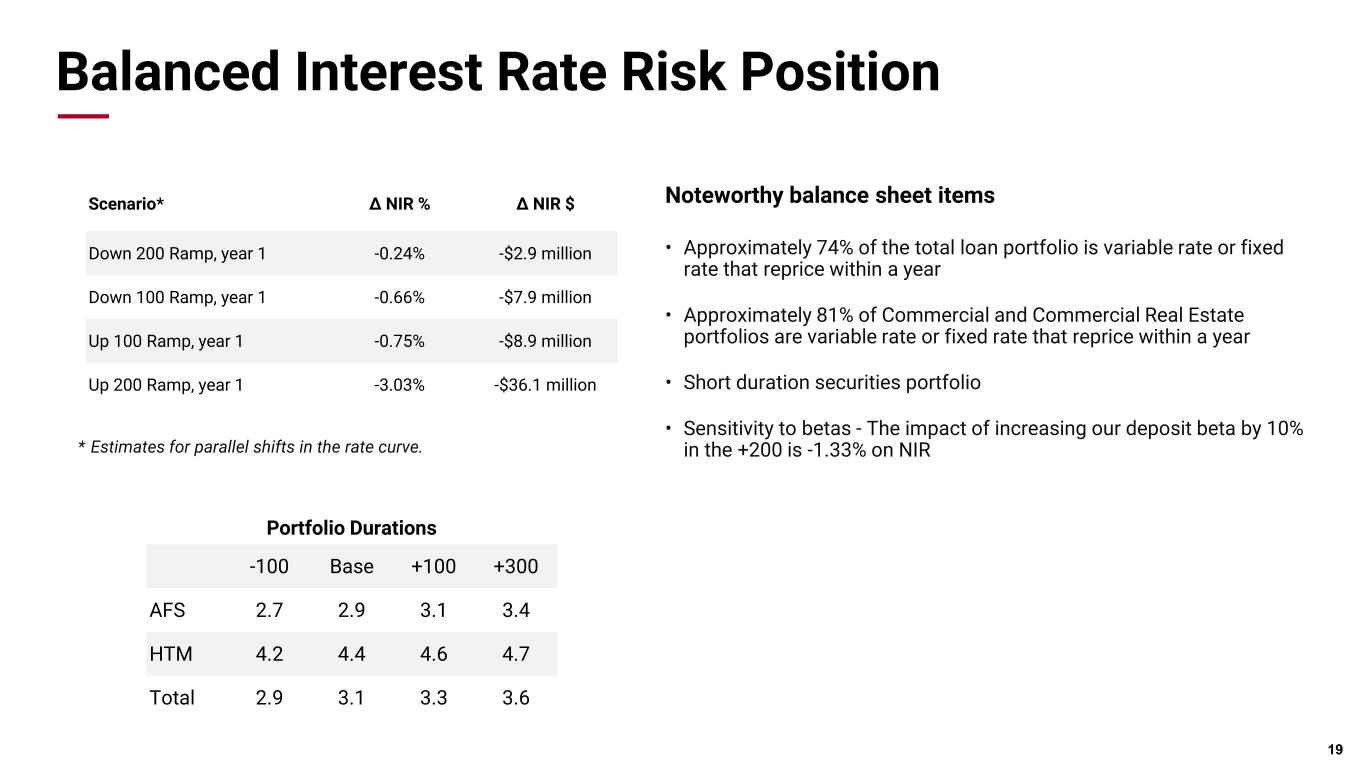 Balanced Interest Rate Risk Position Noteworthy balance sheet items • Approximately 74% of the total loan portfolio is variable rate or fixed rate that reprice within a year • Approximately 81% of Commercial and Commercial Real Estate portfolios are variable rate or fixed rate that reprice within a year • Short duration securities portfolio • Sensitivity to betas - The impact of increasing our deposit beta by 10% in the +200 is -1.33% on NIR 19 Scenario* ∆ NIR % ∆ NIR $ Down 200 Ramp, year 1 -0.24% -$2.9 million Down 100 Ramp, year 1 -0.66% -$7.9 million Up 100 Ramp, year 1 -0.75% -$8.9 million Up 200 Ramp, year 1 -3.03% -$36.1 million * Estimates for parallel shifts in the rate curve. Portfolio Durations -100 Base +100 +300 AFS 2.7 2.9 3.1 3.4 HTM 4.2 4.4 4.6 4.7 Total 2.9 3.1 3.3 3.6