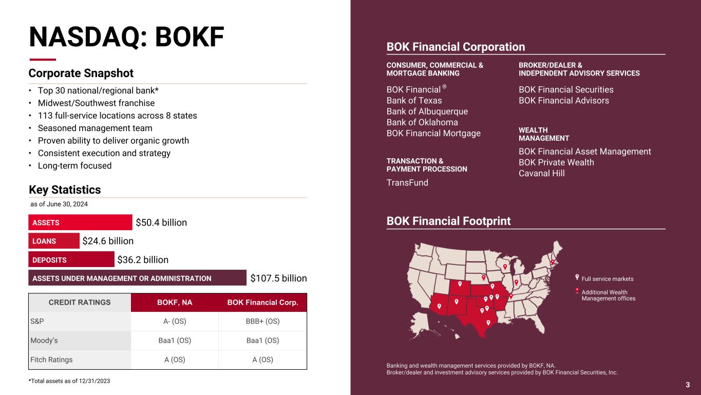 Pri m ar y & se co nd ar y br an d co lor s Data viz colors Data viz monochromatic This presentation contains forward-looking statements that are based on management's beliefs, assumptions, current expectations, estimates and projections about BOK Financial Corporation, the financial services industry, and the economy generally. Words such as “anticipates,” “believes,” “estimates,” “expects,” “forecasts,” “plans,” "outlook", “projects,” “will,” “intends,” variations of such words and similar expressions are intended to identify such forward-looking statements. Management judgments relating to and discussion of the provision and allowance for credit losses, allowance for uncertain tax positions, accruals for loss contingencies and valuation of mortgage servicing rights involve judgments as to expected events and are inherently forward-looking statements. Assessments that acquisitions and growth endeavors will be profitable are necessary statements of belief as to the outcome of future events based in part on information provided by others which BOK Financial has not independently verified. These various forward-looking statements are not guarantees of future performance and involve certain risks, uncertainties, and assumptions which are difficult to predict with regard to timing, extent, likelihood and degree of occurrence. Therefore, actual results and outcomes may materially differ from what is expected, implied or forecasted in such forward-looking statements. Internal and external factors that might cause such a difference include, but are not limited to changes in government, changes in commodity prices, interest rates and interest rate relationships, inflation, demand for products and services, the degree of competition by traditional and nontraditional competitors, changes in banking regulations, tax laws, prices, levies and assessments, the impact of technological advances, and trends in customer behavior as well as their ability to repay loans. For a discussion of risk factors that may cause actual results to differ from expectations, please refer to BOK Financial Corporation’s most recent annual and quarterly reports. BOK Financial Corporation and its affiliates undertake no obligation to update, amend, or clarify forward-looking statements, whether as a result of new information, future events, or otherwise. Non-GAAP Financial Measures: This presentation may refer to non-GAAP financial measures. Additional information on these financial measures is available in BOK Financial’s 10-Q and 10-K filings with the Securities and Exchange Commission which can be accessed at bokf.com. All data is presented as of June 30, 2024 unless otherwise noted. Legal Disclaimers 2