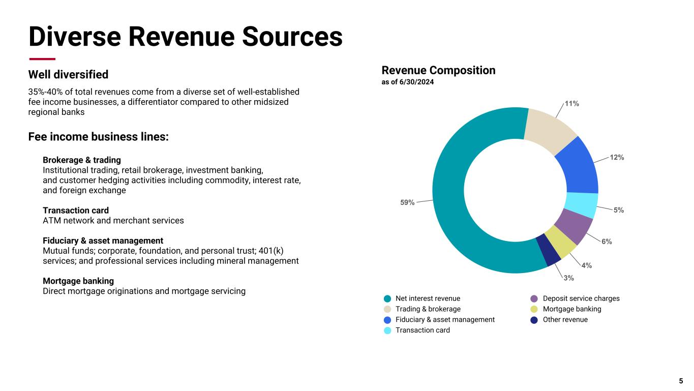 Pri m ar y & se co nd ar y br an d co lor s Data viz colors Data viz monochromatic Diverse Revenue Sources Well diversified 35%-40% of total revenues come from a diverse set of well-established fee income businesses, a differentiator compared to other midsized regional banks Fee income business lines: Brokerage & trading Institutional trading, retail brokerage, investment banking, and customer hedging activities including commodity, interest rate, and foreign exchange Transaction card ATM network and merchant services Fiduciary & asset management Mutual funds; corporate, foundation, and personal trust; 401(k) services; and professional services including mineral management Mortgage banking Direct mortgage originations and mortgage servicing 5 59% 11% 12% 5% 6% 4% 3% Net interest revenue Trading & brokerage Fiduciary & asset management Transaction card Deposit service charges Mortgage banking Other revenue Revenue Composition as of 6/30/2024