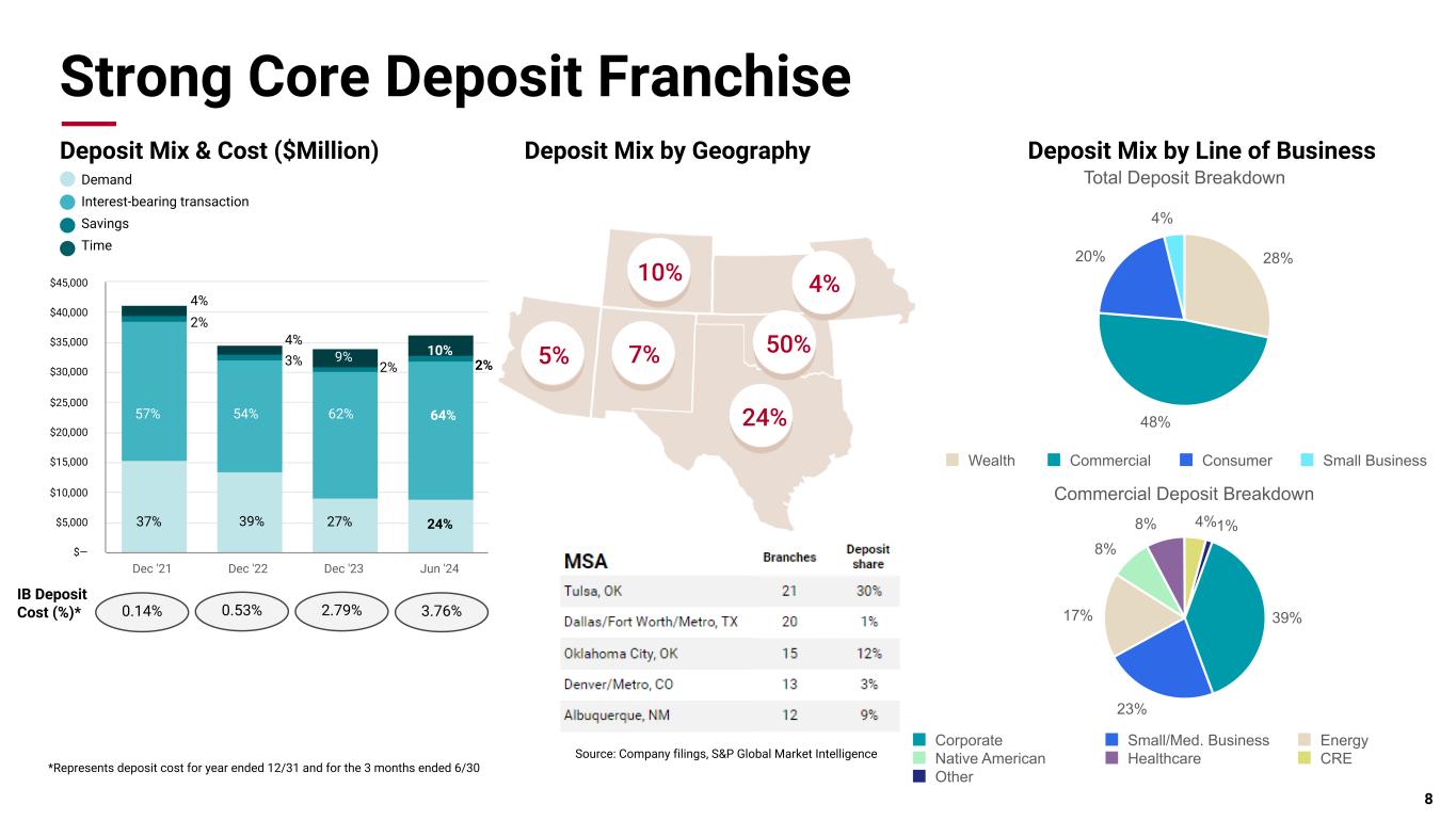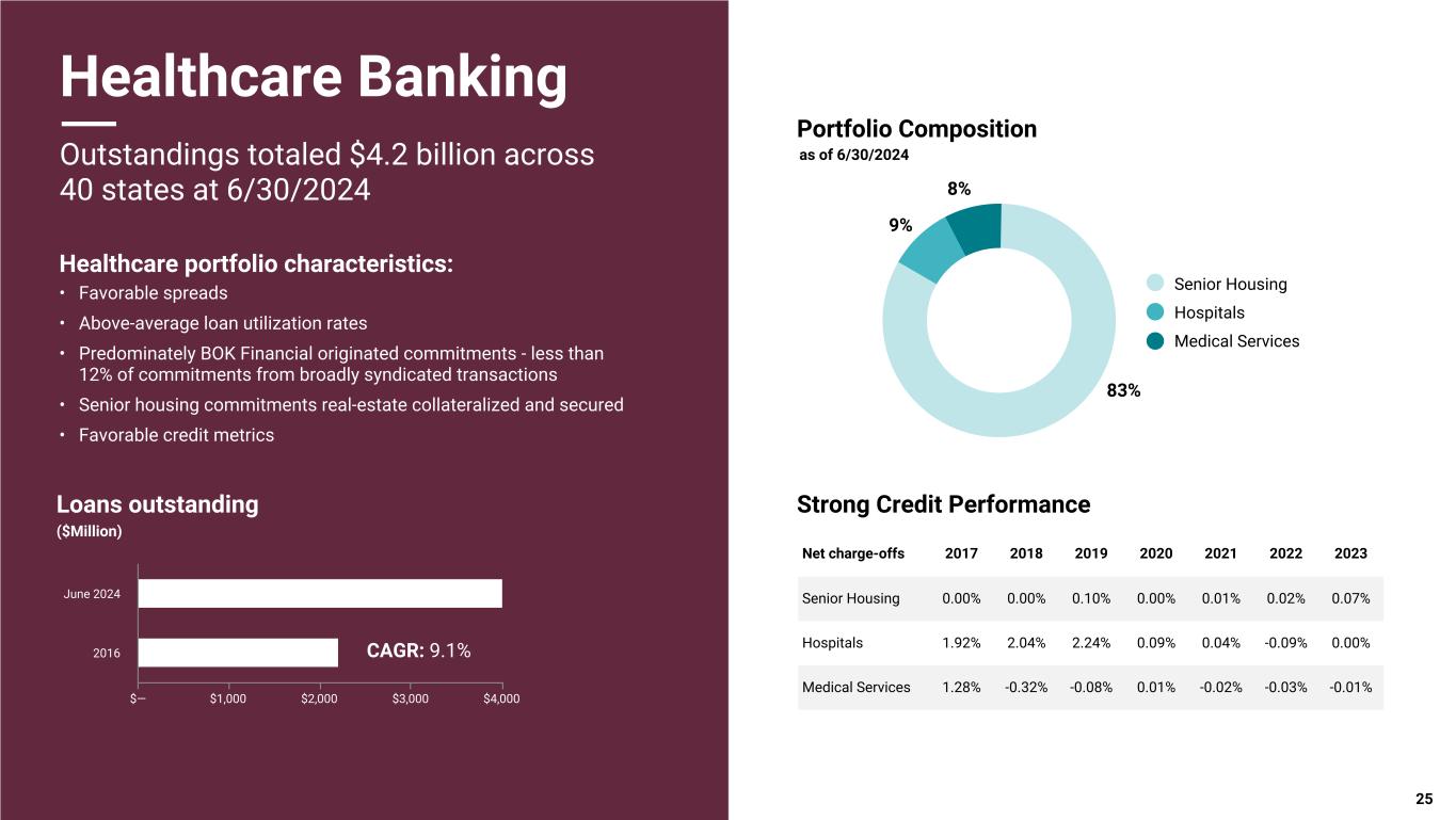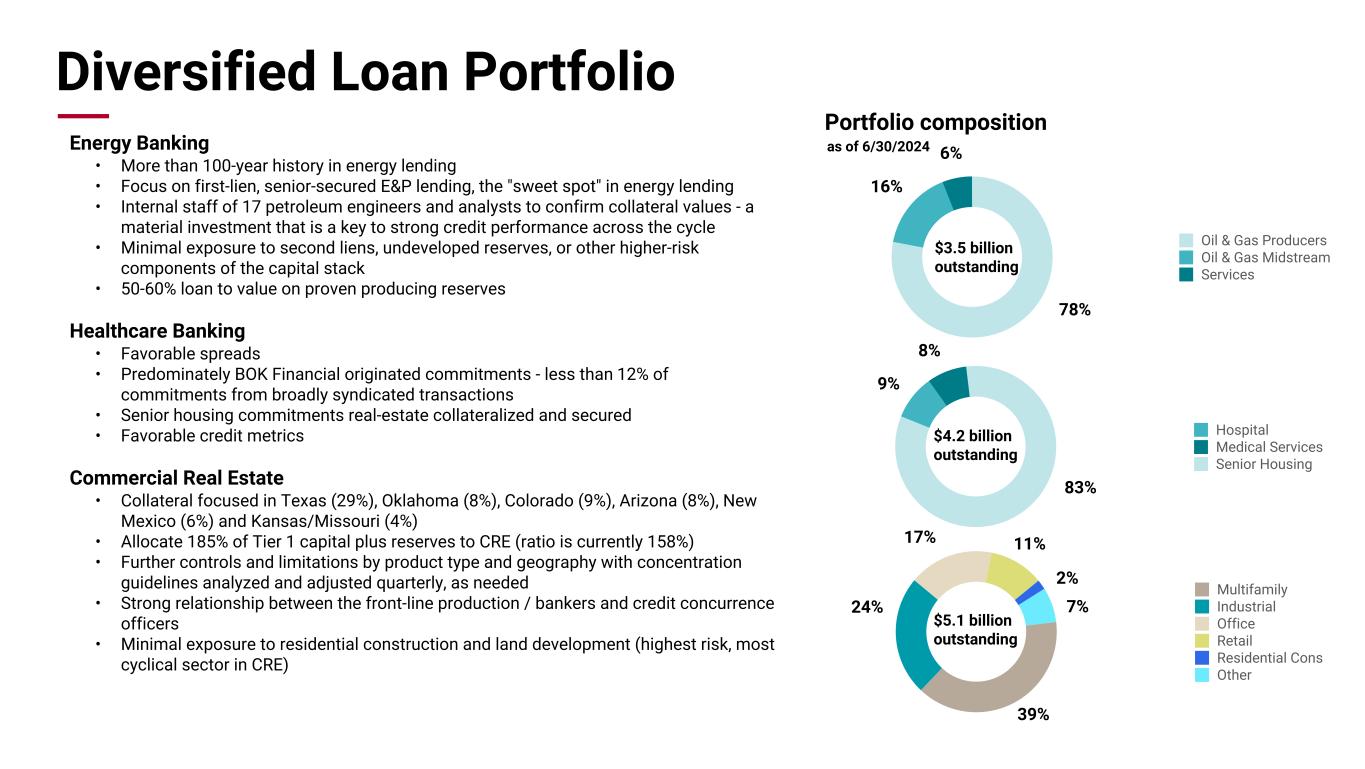 Pri m ar y & se co nd ar y br an d co lor s Data viz colors Data viz monochromatic Diversified Loan Portfolio Portfolio composition as of 6/30/2024 78% 16% 6% Oil & Gas Producers Oil & Gas Midstream Services 9% 8% 83% Hospital Medical Services Senior Housing 39% 24% 17% 11% 2% 7% Multifamily Industrial Office Retail Residential Cons Other Energy Banking • More than 100-year history in energy lending • Focus on first-lien, senior-secured E&P lending, the "sweet spot" in energy lending • Internal staff of 17 petroleum engineers and analysts to confirm collateral values - a material investment that is a key to strong credit performance across the cycle • Minimal exposure to second liens, undeveloped reserves, or other higher-risk components of the capital stack • 50-60% loan to value on proven producing reserves Healthcare Banking • Favorable spreads • Predominately BOK Financial originated commitments - less than 12% of commitments from broadly syndicated transactions • Senior housing commitments real-estate collateralized and secured • Favorable credit metrics Commercial Real Estate • Collateral focused in Texas (29%), Oklahoma (8%), Colorado (9%), Arizona (8%), New Mexico (6%) and Kansas/Missouri (4%) • Allocate 185% of Tier 1 capital plus reserves to CRE (ratio is currently 158%) • Further controls and limitations by product type and geography with concentration guidelines analyzed and adjusted quarterly, as needed • Strong relationship between the front-line production / bankers and credit concurrence officers • Minimal exposure to residential construction and land development (highest risk, most cyclical sector in CRE) $3.5 billion outstanding $4.2 billion outstanding $5.1 billion outstanding