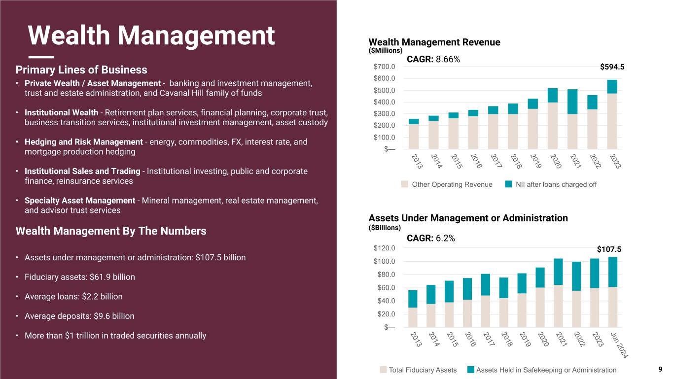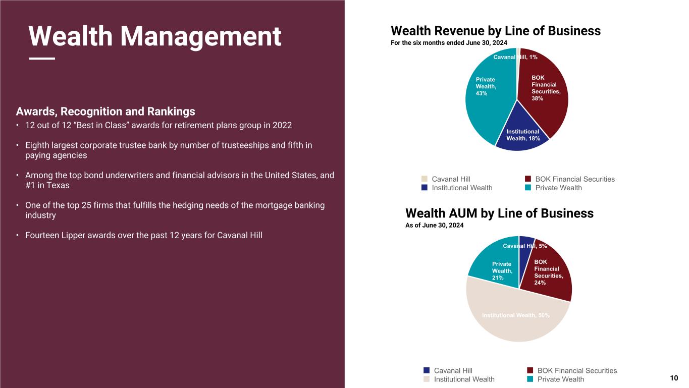 Pri m ar y & se co nd ar y br an d co lor s Data viz colors Data viz monochromatic Wealth Management Primary Lines of Business • Private Wealth / Asset Management - banking and investment management, trust and estate administration, and Cavanal Hill family of funds • Institutional Wealth - Retirement plan services, financial planning, corporate trust, business transition services, institutional investment management, asset custody • Hedging and Risk Management - energy, commodities, FX, interest rate, and mortgage production hedging • Institutional Sales and Trading - Institutional investing, public and corporate finance, reinsurance services • Specialty Asset Management - Mineral management, real estate management, and advisor trust services Wealth Management By The Numbers • Assets under management or administration: $107.5 billion • Fiduciary assets: $61.9 billion • Average loans: $2.2 billion • Average deposits: $9.6 billion • More than $1 trillion in traded securities annually Assets Under Management or Administration ($Billions) Wealth Management Revenue ($Millions) 9Total Fiduciary Assets Assets Held in Safekeeping or Administration 2013 2014 2015 2016 2017 2018 2019 2020 2021 2022 2023 Jun 2024 $— $20.0 $40.0 $60.0 $80.0 $100.0 $120.0 CAGR: 6.2% Other Operating Revenue NII after loans charged off 2013 2014 2015 2016 2017 2018 2019 2020 2021 2022 2023 $— $100.0 $200.0 $300.0 $400.0 $500.0 $600.0 $700.0 CAGR: 8.66% $594.5 $107.5