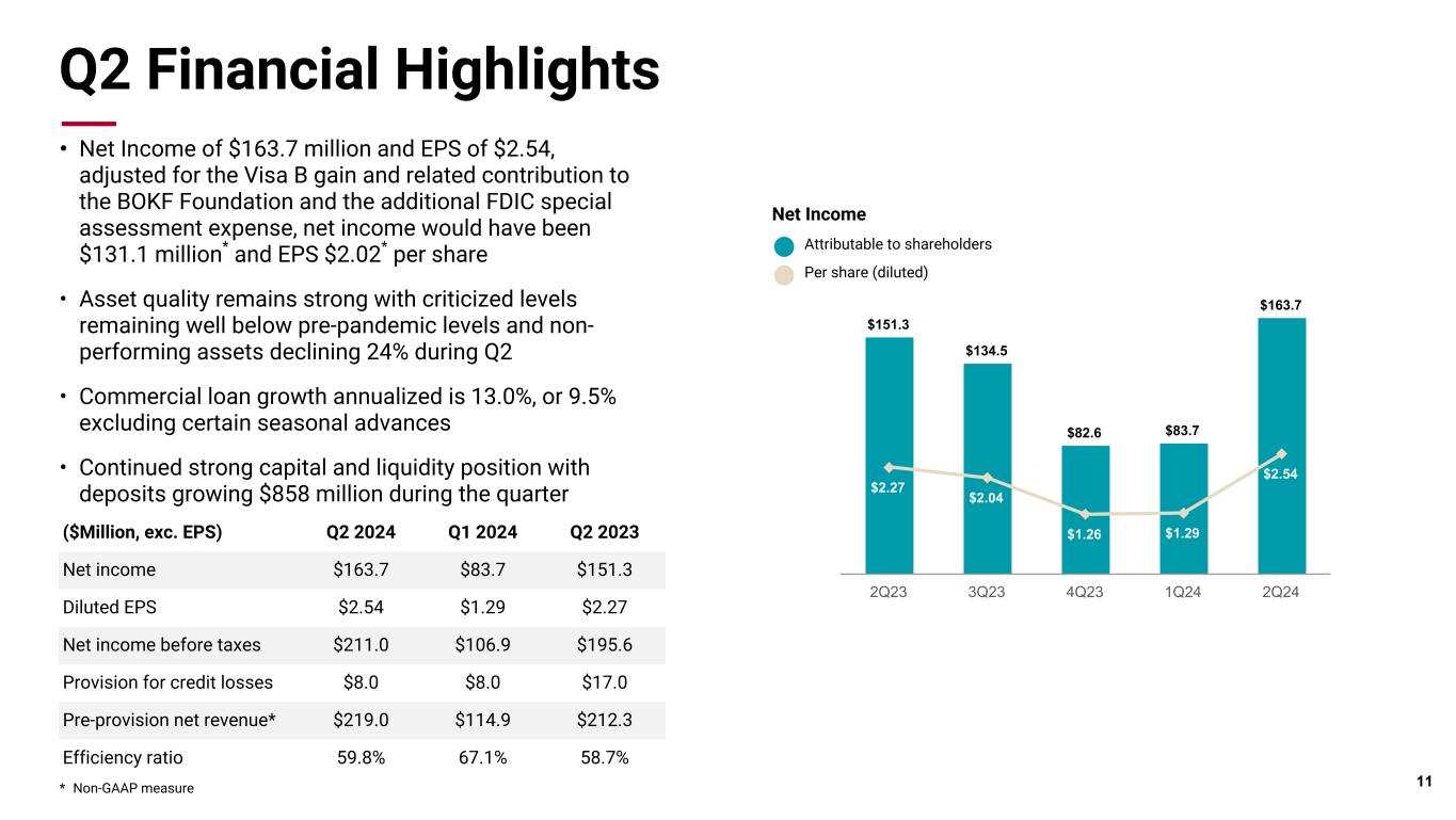 Pri m ar y & se co nd ar y br an d co lor s Data viz colors Data viz monochromatic Wealth Management Awards, Recognition and Rankings • 12 out of 12 “Best in Class” awards for retirement plans group in 2022 • Eighth largest corporate trustee bank by number of trusteeships and fifth in paying agencies • Among the top bond underwriters and financial advisors in the United States, and #1 in Texas • One of the top 25 firms that fulfills the hedging needs of the mortgage banking industry • Fourteen Lipper awards over the past 12 years for Cavanal Hill 10 Cavanal Hill, 1% BOK Financial Securities, 38% Institutional Wealth, 18% Private Wealth, 43% Cavanal Hill BOK Financial Securities Institutional Wealth Private Wealth Cavanal Hill, 5% BOK Financial Securities, 24% Institutional Wealth, 50% Private Wealth, 21% Cavanal Hill BOK Financial Securities Institutional Wealth Private Wealth Wealth AUM by Line of Business Wealth Revenue by Line of Business For the six months ended June 30, 2024 As of June 30, 2024