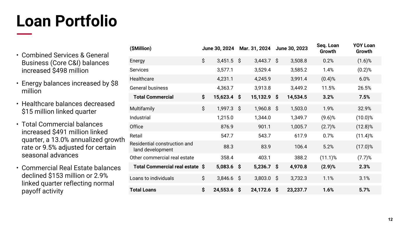 Pri m ar y & se co nd ar y br an d co lor s Data viz colors Data viz monochromatic Loan Portfolio 12 ($Million) June 30, 2024 Mar. 31, 2024 June 30, 2023 Seq. Loan Growth YOY Loan Growth Energy $ 3,451.5 $ 3,443.7 $ 3,508.8 0.2% (1.6)% Services 3,577.1 3,529.4 3,585.2 1.4% (0.2)% Healthcare 4,231.1 4,245.9 3,991.4 (0.4)% 6.0% General business 4,363.7 3,913.8 3,449.2 11.5% 26.5% Total Commercial $ 15,623.4 $ 15,132.9 $ 14,534.5 3.2% 7.5% Multifamily $ 1,997.3 $ 1,960.8 $ 1,503.0 1.9% 32.9% Industrial 1,215.0 1,344.0 1,349.7 (9.6)% (10.0)% Office 876.9 901.1 1,005.7 (2.7)% (12.8)% Retail 547.7 543.7 617.9 0.7% (11.4)% Residential construction and land development 88.3 83.9 106.4 5.2% (17.0)% Other commercial real estate 358.4 403.1 388.2 (11.1)% (7.7)% Total Commercial real estate $ 5,083.6 $ 5,236.7 $ 4,970.8 (2.9)% 2.3% Loans to individuals $ 3,846.6 $ 3,803.0 $ 3,732.3 1.1% 3.1% Total Loans $ 24,553.6 $ 24,172.6 $ 23,237.7 1.6% 5.7% • Combined Services & General Business (Core C&I) balances increased $498 million • Energy balances increased by $8 million • Healthcare balances decreased $15 million linked quarter • Total Commercial balances increased $491 million linked quarter, a 13.0% annualized growth rate or 9.5% adjusted for certain seasonal advances • Commercial Real Estate balances declined $153 million or 2.9% linked quarter reflecting normal payoff activity