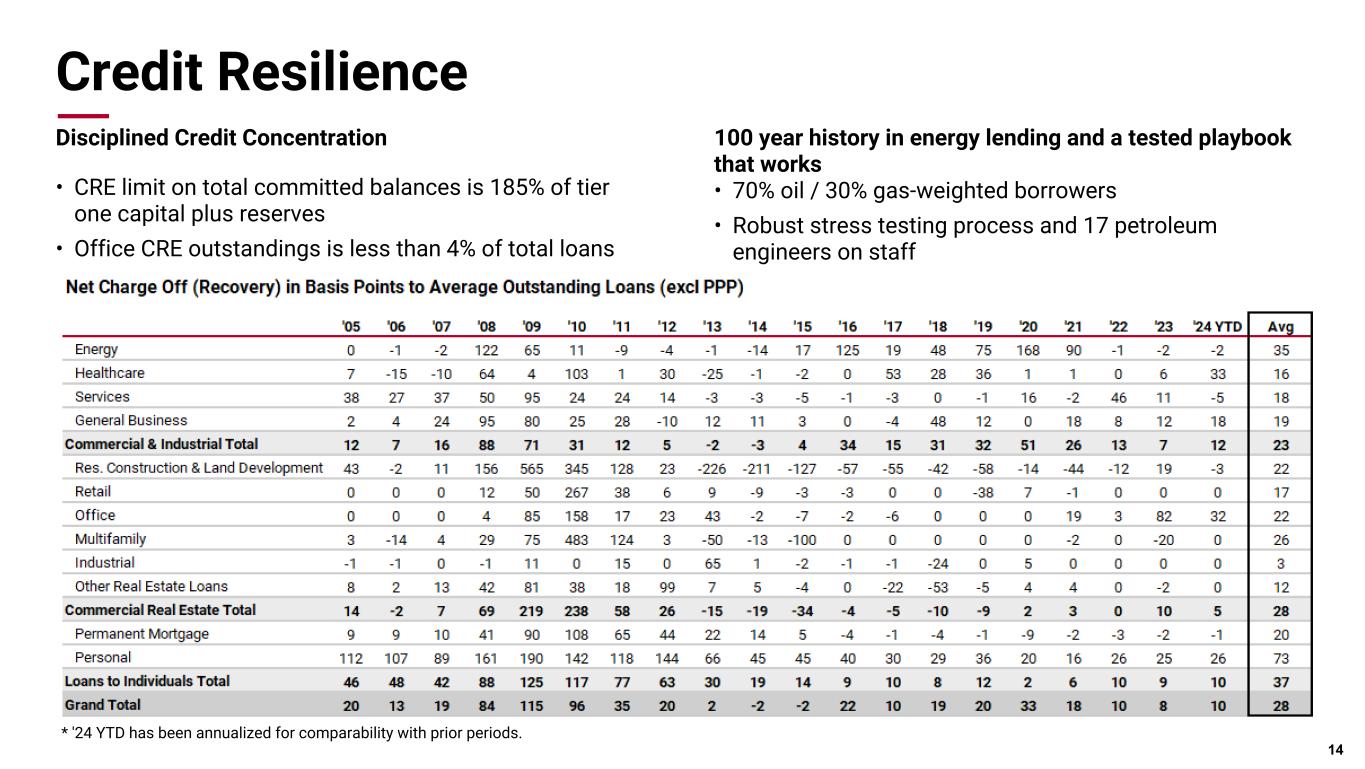 Pri m ar y & se co nd ar y br an d co lor s Data viz colors Data viz monochromatic Credit Quality Metrics • Credit quality remains better than pre-pandemic level with a 24% decline in non-performing assets during the quarter • Trailing 12 months net charge-offs at 9 bps • CRE office exposure is less than 4% of outstanding period end total loan balances, with properties in resilient markets • $8 million credit provision in Q2; with a combined allowance for credit losses of $330 million or 1.34% Net Charge-Offs to Average Loans CRE Office by Location Annualized 13 0.12% 0.11% 0.07% 0.09% 0.11% 2Q23 3Q23 4Q23 1Q24 2Q24 —% 0.20% 0.40% 0.60% 19.1% 18.0% 10.2% 9.4% 11.2% 4Q18 4Q19 4Q23 1Q24 2Q24 —% 10.0% 20.0% 30.0% Committed Criticized Assets / Tier 1 Capital & Reserves In Footprint, 66% Out of Footprint, 33% California, 1% New York, 0%