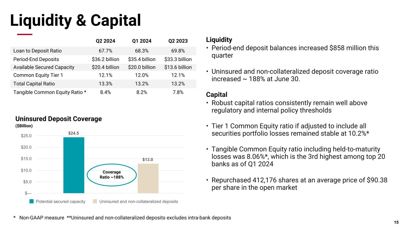 Pri m ar y & se co nd ar y br an d co lor s Data viz colors Data viz monochromatic Credit Resilience Disciplined Credit Concentration • CRE limit on total committed balances is 185% of tier one capital plus reserves • Office CRE outstandings is less than 4% of total loans 14 100 year history in energy lending and a tested playbook that works • 70% oil / 30% gas-weighted borrowers • Robust stress testing process and 17 petroleum engineers on staff * '24 YTD has been annualized for comparability with prior periods.