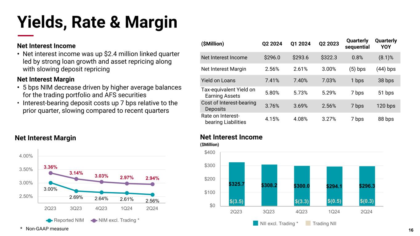 Pri m ar y & se co nd ar y br an d co lor s Data viz colors Data viz monochromatic Liquidity & Capital * Non-GAAP measure **Uninsured and non-collateralized deposits excludes intra-bank deposits 15 Q2 2024 Q1 2024 Q2 2023 Loan to Deposit Ratio 67.7% 68.3% 69.8% Period-End Deposits $36.2 billion $35.4 billion $33.3 billion Available Secured Capacity $20.4 billion $20.0 billion $13.6 billion Common Equity Tier 1 12.1% 12.0% 12.1% Total Capital Ratio 13.3% 13.2% 13.2% Tangible Common Equity Ratio * 8.4% 8.2% 7.8% $24.5 $13.0 Potential secured capacity Uninsured and non-collateralized deposits $— $5.0 $10.0 $15.0 $20.0 $25.0 Coverage Ratio ~188% Uninsured Deposit Coverage ($Billion) Liquidity • Period-end deposit balances increased $858 million this quarter • Uninsured and non-collateralized deposit coverage ratio increased ~ 188% at June 30. Capital • Robust capital ratios consistently remain well above regulatory and internal policy thresholds • Tier 1 Common Equity ratio if adjusted to include all securities portfolio losses remained stable at 10.2%* • Tangible Common Equity ratio including held-to-maturity losses was 8.06%*, which is the 3rd highest among top 20 banks as of Q1 2024 • Repurchased 412,176 shares at an average price of $90.38 per share in the open market