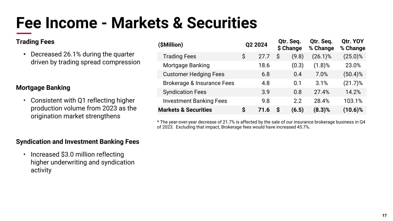 Pri m ar y & se co nd ar y br an d co lor s Data viz colors Data viz monochromatic Yields, Rate & Margin Net Interest Income • Net interest income was up $2.4 million linked quarter led by strong loan growth and asset repricing along with slowing deposit repricing Net Interest Margin • 5 bps NIM decrease driven by higher average balances for the trading portfolio and AFS securities • Interest-bearing deposit costs up 7 bps relative to the prior quarter, slowing compared to recent quarters 16 ($Million) Q2 2024 Q1 2024 Q2 2023 Quarterly sequential Quarterly YOY Net Interest Income $296.0 $293.6 $322.3 0.8% (8.1)% Net Interest Margin 2.56% 2.61% 3.00% (5) bps (44) bps Yield on Loans 7.41% 7.40% 7.03% 1 bps 38 bps Tax-equivalent Yield on Earning Assets 5.80% 5.73% 5.29% 7 bps 51 bps Cost of Interest-bearing Deposits 3.76% 3.69% 2.56% 7 bps 120 bps Rate on Interest- bearing Liabilities 4.15% 4.08% 3.27% 7 bps 88 bps Net Interest Income ($Million) $325.7 $308.2 $300.0 $294.1 $296.3 $(3.5) $(3.3) $(0.5) $(0.3) NII excl. Trading * Trading NII 2Q23 3Q23 4Q23 1Q24 2Q24 $0 $100 $200 $300 $400 3.00% 2.69% 2.64% 2.61% 2.56% 3.36% 3.14% 3.03% 2.97% 2.94% Reported NIM NIM excl. Trading * 2Q23 3Q23 4Q23 1Q24 2Q24 2.50% 3.00% 3.50% 4.00% Net Interest Margin * Non-GAAP measure
