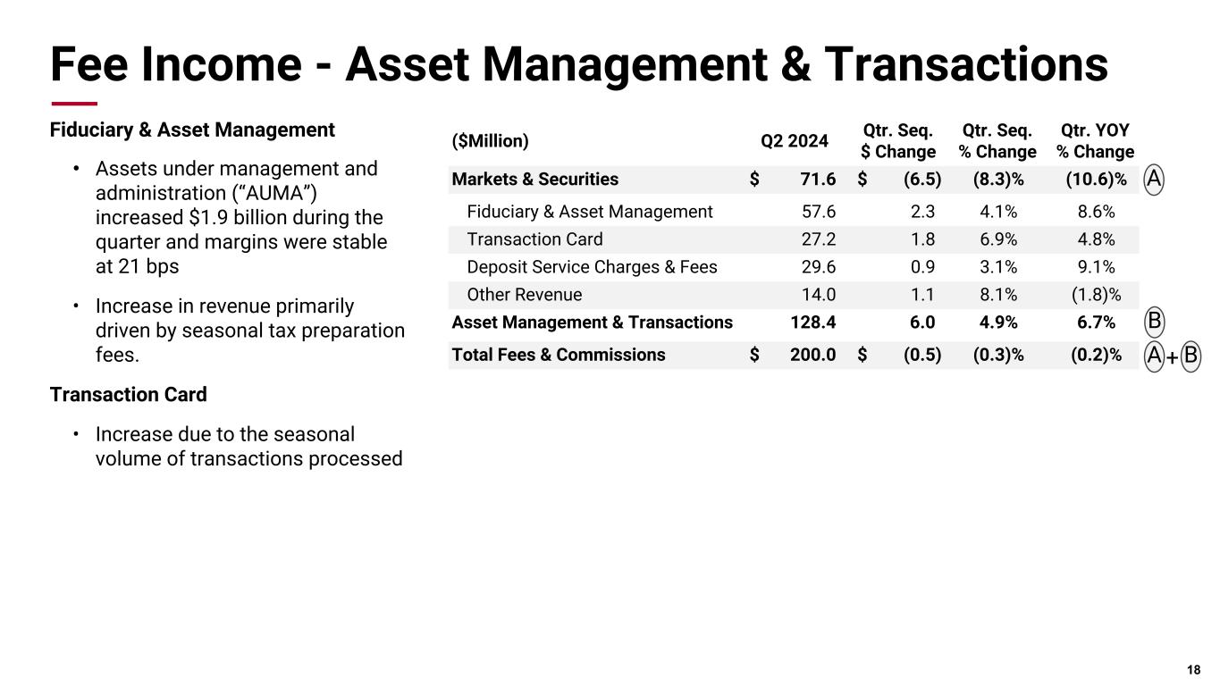 Pri m ar y & se co nd ar y br an d co lor s Data viz colors Data viz monochromatic Fee Income - Markets & Securities 17 ($Million) Q2 2024 Qtr. Seq. $ Change Qtr. Seq. % Change Qtr. YOY % Change Trading Fees $ 27.7 $ (9.8) (26.1)% (25.0)% Mortgage Banking 18.6 (0.3) (1.8)% 23.0% Customer Hedging Fees 6.8 0.4 7.0% (50.4)% Brokerage & Insurance Fees 4.8 0.1 3.1% (21.7)% Syndication Fees 3.9 0.8 27.4% 14.2% Investment Banking Fees 9.8 2.2 28.4% 103.1% Markets & Securities $ 71.6 $ (6.5) (8.3)% (10.6)% * The year-over-year decrease of 21.7% is affected by the sale of our insurance brokerage business in Q4 of 2023. Excluding that impact, Brokerage fees would have increased 45.7%. Trading Fees • Decreased 26.1% during the quarter driven by trading spread compression Mortgage Banking • Consistent with Q1 reflecting higher production volume from 2023 as the origination market strengthens Syndication and Investment Banking Fees • Increased $3.0 million reflecting higher underwriting and syndication activity