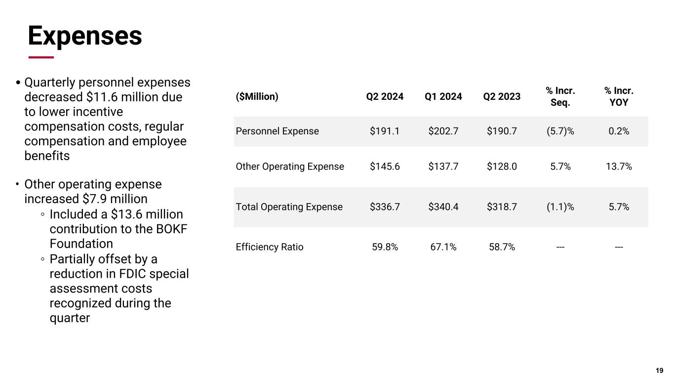 Pri m ar y & se co nd ar y br an d co lor s Data viz colors Data viz monochromatic Fee Income - Asset Management & Transactions 18 ($Million) Q2 2024 Qtr. Seq. $ Change Qtr. Seq. % Change Qtr. YOY % Change Markets & Securities $ 71.6 $ (6.5) (8.3)% (10.6)% Fiduciary & Asset Management 57.6 2.3 4.1% 8.6% Transaction Card 27.2 1.8 6.9% 4.8% Deposit Service Charges & Fees 29.6 0.9 3.1% 9.1% Other Revenue 14.0 1.1 8.1% (1.8)% Asset Management & Transactions 128.4 6.0 4.9% 6.7% Total Fees & Commissions $ 200.0 $ (0.5) (0.3)% (0.2)% B+A A B Fiduciary & Asset Management • Assets under management and administration (“AUMA”) increased $1.9 billion during the quarter and margins were stable at 21 bps • Increase in revenue primarily driven by seasonal tax preparation fees. Transaction Card • Increase due to the seasonal volume of transactions processed