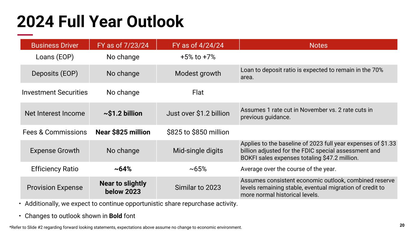 Pri m ar y & se co nd ar y br an d co lor s Data viz colors Data viz monochromatic Expenses 19 ($Million) Q2 2024 Q1 2024 Q2 2023 % Incr. Seq. % Incr. YOY Personnel Expense $191.1 $202.7 $190.7 (5.7)% 0.2% Other Operating Expense $145.6 $137.7 $128.0 5.7% 13.7% Total Operating Expense $336.7 $340.4 $318.7 (1.1)% 5.7% Efficiency Ratio 59.8% 67.1% 58.7% --- --- • Quarterly personnel expenses decreased $11.6 million due to lower incentive compensation costs, regular compensation and employee benefits • Other operating expense increased $7.9 million ◦ Included a $13.6 million contribution to the BOKF Foundation ◦ Partially offset by a reduction in FDIC special assessment costs recognized during the quarter