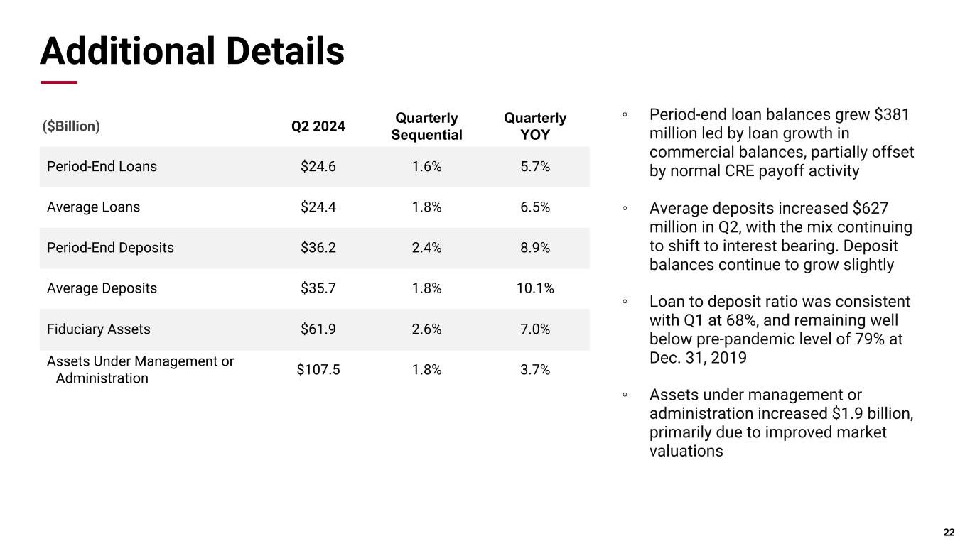 Pri m ar y & se co nd ar y br an d co lor s Data viz colors Data viz monochromatic Additional Details 22 ◦ Period-end loan balances grew $381 million led by loan growth in commercial balances, partially offset by normal CRE payoff activity ◦ Average deposits increased $627 million in Q2, with the mix continuing to shift to interest bearing. Deposit balances continue to grow slightly ◦ Loan to deposit ratio was consistent with Q1 at 68%, and remaining well below pre-pandemic level of 79% at Dec. 31, 2019 ◦ Assets under management or administration increased $1.9 billion, primarily due to improved market valuations ($Billion) Q2 2024 Quarterly Sequential Quarterly YOY Period-End Loans $24.6 1.6% 5.7% Average Loans $24.4 1.8% 6.5% Period-End Deposits $36.2 2.4% 8.9% Average Deposits $35.7 1.8% 10.1% Fiduciary Assets $61.9 2.6% 7.0% Assets Under Management or Administration $107.5 1.8% 3.7%