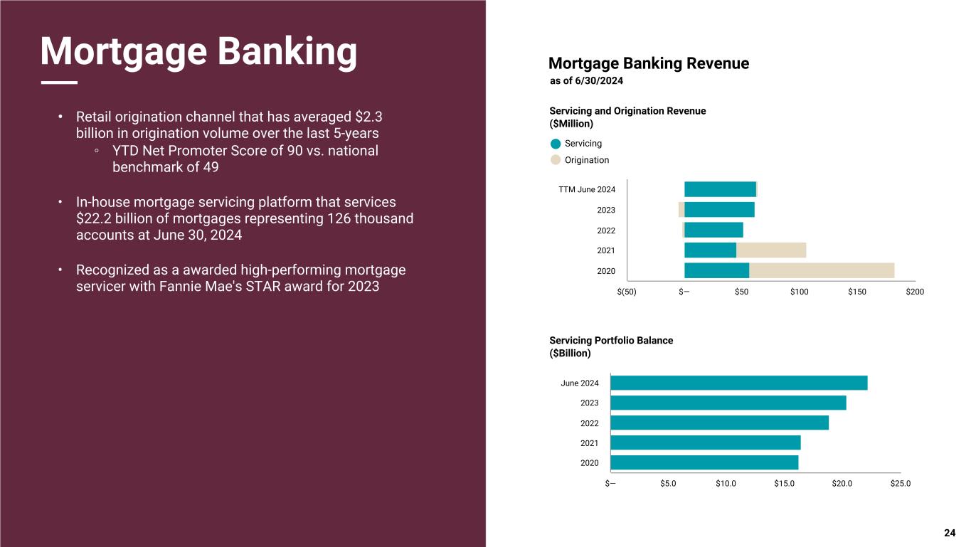 Pri m ar y & se co nd ar y br an d co lor s Data viz colors Data viz monochromatic Mortgage Banking • Retail origination channel that has averaged $2.3 billion in origination volume over the last 5-years ◦ YTD Net Promoter Score of 90 vs. national benchmark of 49 • In-house mortgage servicing platform that services $22.2 billion of mortgages representing 126 thousand accounts at June 30, 2024 • Recognized as a awarded high-performing mortgage servicer with Fannie Mae's STAR award for 2023 Servicing and Origination Revenue ($Million) Mortgage Banking Revenue as of 6/30/2024 Servicing Portfolio Balance ($Billion) Servicing Origination 24 $(50) $— $50 $100 $150 $200 TTM June 2024 2023 2022 2021 2020 $— $5.0 $10.0 $15.0 $20.0 $25.0 June 2024 2023 2022 2021 2020