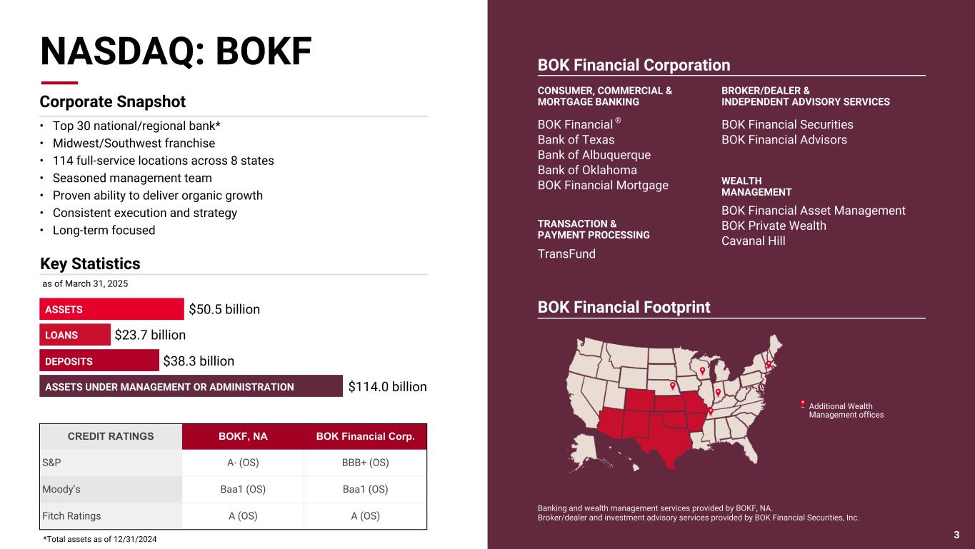 Pri m ar y & se co nd ar y br an d co lor s Data viz colors Data viz monochromatic Legal Disclaimers 2 This presentation contains forward-looking statements that are based on management's beliefs, assumptions, current expectations, estimates and projections about BOK Financial Corporation, the financial services industry, and the economy generally. Words such as “anticipates,” “believes,” “estimates,” “expects,” “forecasts,” “plans,” "outlook," “projects,” “will,” “intends,” variations of such words and similar expressions are intended to identify such forward-looking statements. Management judgments relating to and discussion of the provision and allowance for credit losses, allowance for uncertain tax positions, accruals for loss contingencies and valuation of mortgage servicing rights involve judgments as to expected events and are inherently forward-looking statements. Assessments that acquisitions and growth endeavors will be profitable are necessary statements of belief as to the outcome of future events based in part on information provided by others which BOK Financial has not independently verified. These various forward-looking statements are not guarantees of future performance and involve certain risks, uncertainties, and assumptions which are difficult to predict with regard to timing, extent, likelihood and degree of occurrence. Therefore, actual results and outcomes may materially differ from what is expected, implied or forecasted in such forward-looking statements. Internal and external factors that might cause such a difference include, but are not limited to changes in government, changes in governmental economic policy, including tariffs, changes in commodity prices, interest rates and interest rate relationships, inflation, demand for products and services, the degree of competition by traditional and nontraditional competitors, changes in banking regulations, tax laws, prices, levies and assessments, the impact of technological advances, and trends in customer behavior as well as their ability to repay loans. For a discussion of risk factors that may cause actual results to differ from expectations, please refer to BOK Financial Corporation’s most recent annual and quarterly reports. BOK Financial Corporation and its affiliates undertake no obligation to update, amend, or clarify forward-looking statements, whether as a result of new information, future events, or otherwise. Non-GAAP Financial Measures: This presentation may refer to non-GAAP financial measures. Additional information on these financial measures is available in BOK Financial’s Form 8-K filings furnished pursuant to Item 2.02, which can be accessed at bokf.com. All data is presented as of March 31, 2025 unless otherwise noted.