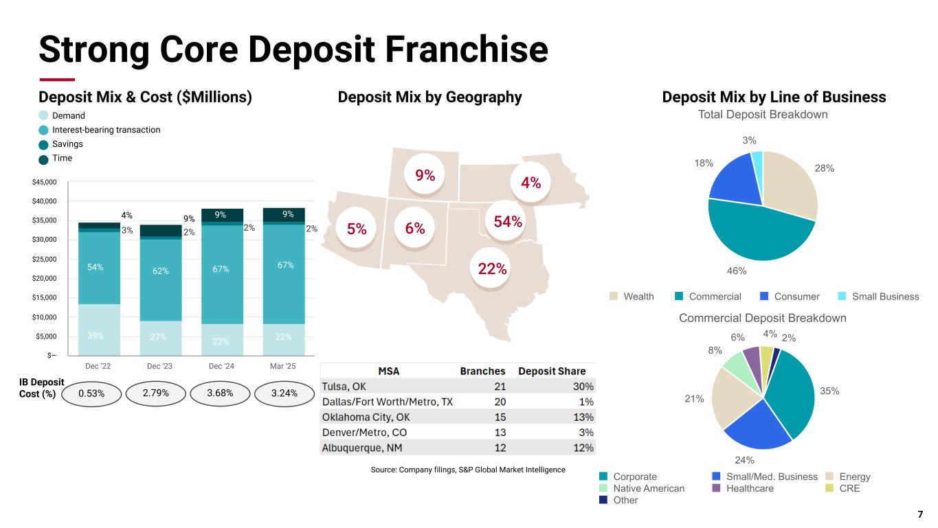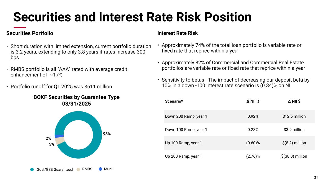 Pri m ar y & se co nd ar y br an d co lor s Data viz colors Data viz monochromatic Diversified Loan Portfolio Portfolio Composition as of 3/31/2025 79% 12% 8% Oil & Gas Producers Oil & Gas Midstream Services 10% 9% 81% Hospital Medical Services Senior Housing 45% 23% 14% 10% 2% 6% Multifamily Industrial Office Retail Residential Cons Other Energy Banking • More than 100-year history in energy lending • Focus on first-lien, senior-secured E&P lending, the "sweet spot" in energy lending • Seasoned internal petroleum engineering staff to confirm collateral values - a material investment that is a key to strong credit performance across the cycle • Minimal exposure to second liens, undeveloped reserves, or other higher-risk components of the capital stack • 50-60% loan to value on proven producing reserves Healthcare Banking • Favorable spreads • Predominately BOK Financial originated commitments • Senior housing commitments real-estate collateralized and secured • Favorable credit metrics Commercial Real Estate • Collateral focused in Texas (30%), Colorado (11%), Arizona (9%), Oklahoma (7%), New Mexico (6%) and Kansas/Missouri (4%) • Allocate 185% of Tier 1 capital plus reserves to CRE (ratio is currently 152%) • Further controls and limitations by product type and geography with concentration guidelines analyzed and adjusted quarterly, as needed • Strong relationship between the front-line production/bankers and credit concurrence officers • Minimal exposure to residential construction and land development (highest risk, most cyclical sector in CRE) $2.9 billion outstanding $3.8 billion outstanding $5.2 billion outstanding 6