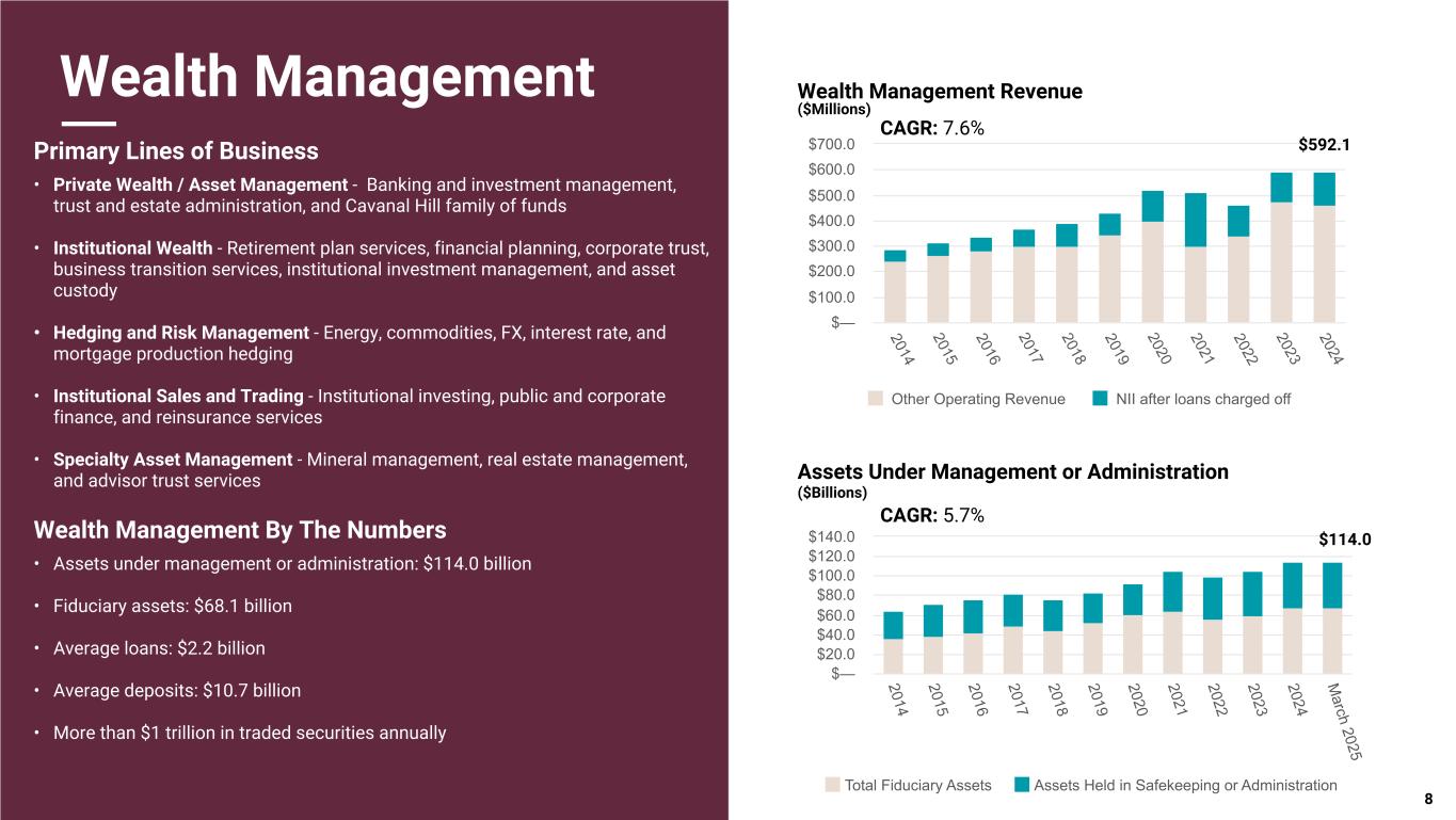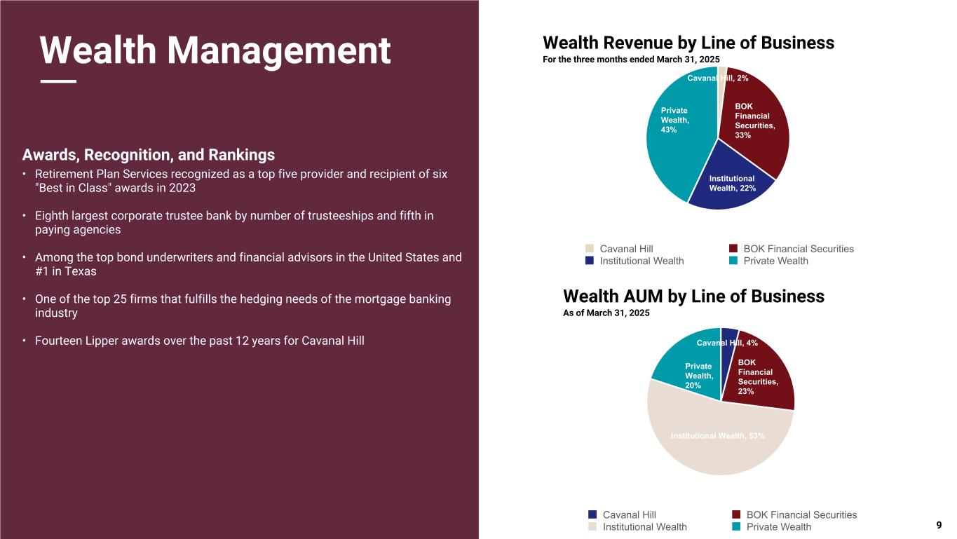 Pri m ar y & se co nd ar y br an d co lor s Data viz colors Data viz monochromatic Wealth Management Primary Lines of Business • Private Wealth / Asset Management - Banking and investment management, trust and estate administration, and Cavanal Hill family of funds • Institutional Wealth - Retirement plan services, financial planning, corporate trust, business transition services, institutional investment management, and asset custody • Hedging and Risk Management - Energy, commodities, FX, interest rate, and mortgage production hedging • Institutional Sales and Trading - Institutional investing, public and corporate finance, and reinsurance services • Specialty Asset Management - Mineral management, real estate management, and advisor trust services Wealth Management By The Numbers • Assets under management or administration: $114.0 billion • Fiduciary assets: $68.1 billion • Average loans: $2.2 billion • Average deposits: $10.7 billion • More than $1 trillion in traded securities annually Assets Under Management or Administration ($Billions) Wealth Management Revenue ($Millions) 8 Total Fiduciary Assets Assets Held in Safekeeping or Administration 2014 2015 2016 2017 2018 2019 2020 2021 2022 2023 2024 M arch 2025 $— $20.0 $40.0 $60.0 $80.0 $100.0 $120.0 $140.0 CAGR: 5.7% Other Operating Revenue NII after loans charged off 2014 2015 2016 2017 2018 2019 2020 2021 2022 2023 2024 $— $100.0 $200.0 $300.0 $400.0 $500.0 $600.0 $700.0 CAGR: 7.6% $592.1 $114.0