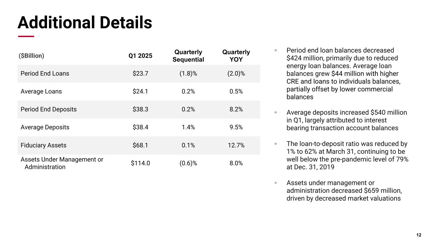 Pri m ar y & se co nd ar y br an d co lor s Data viz colors Data viz monochromatic Q1 Financial Highlights * Non-GAAP measure Attributable to shareholders Per share (diluted) Net Income • Net Income was $119.8 million, or $1.86 per diluted share • Net interest margin expanded 3 basis points with core net interest margin excluding trading declining 4 basis points • Asset quality remains very strong with non-performing assets, excluding loans guaranteed by U.S. government agencies, totaling $79 million or 0.33% of outstanding loans and repossessed assets. Net charge-offs were $1.1 million during Q1 • Period end loans decreased 1.8% to $23.7 billion. Excluding the decrease in the energy portfolio, loan balances were relatively consistent with the prior quarter • Continued strong capital and liquidity position with TCE reaching 9.5% during the quarter and a loan to deposit ratio of 62% 11 $83.7 $163.7 $140.0 $136.2 $119.8 $1.29 $2.54 $2.18 $2.12 $1.86 1Q24 2Q24 3Q24 4Q24 1Q25 ($Million, exc. EPS) Q1 2025 Q4 2024 Q1 2024 Net income $119.8 $136.2 $83.7 Diluted EPS $1.86 $2.12 $1.29 Net income before taxes $154.8 $175.4 $106.9 Provision for credit losses $0.0 $0.0 $8.0 Pre-provision net revenue* $154.8 $175.4 $114.9 Efficiency ratio* 68.3% 65.6% 67.1% Revenue Composition as of 3/31/2025 63% 6% 12% 5% 6% 4% 4% Net Interest Income Trading & Brokerage Fiduciary & Asset Management Transaction Card Deposit Service Charges Mortgage Banking Other Revenue