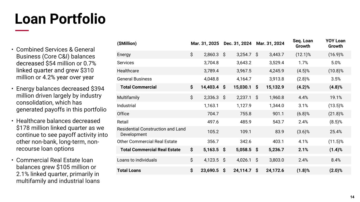 Pri m ar y & se co nd ar y br an d co lor s Data viz colors Data viz monochromatic Credit Resilience Disciplined Credit Concentration • CRE limit on total committed balances is 185% of tier one capital plus reserves • Office CRE outstandings only comprise 3% of total loans 13 100 year history in energy lending and a tested playbook • 72% oil / 28% gas-weighted borrowers • Robust stress testing process and 17 petroleum engineers on staff * '25 YTD has been annualized for comparability with prior periods.