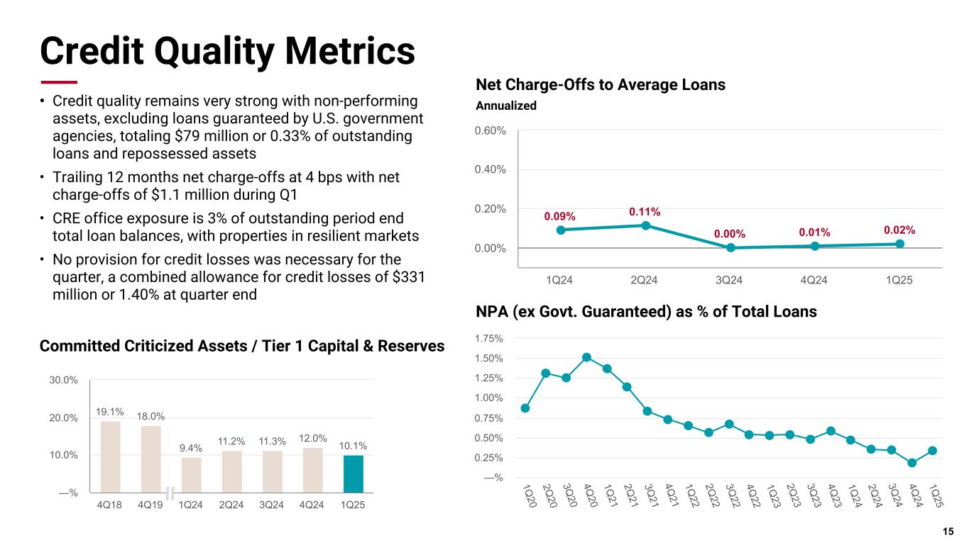 Pri m ar y & se co nd ar y br an d co lor s Data viz colors Data viz monochromatic Loan Portfolio • Combined Services & General Business (Core C&I) balances decreased $54 million or 0.7% linked quarter and grew $310 million or 4.2% year over year • Energy balances decreased $394 million driven largely by industry consolidation, which has generated payoffs in this portfolio • Healthcare balances decreased $178 million linked quarter as we continue to see payoff activity into other non-bank, long-term, non- recourse loan options • Commercial Real Estate loan balances grew $105 million or 2.1% linked quarter, primarily in multifamily and industrial loans 14 ($Million) Mar. 31, 2025 Dec. 31, 2024 Mar. 31, 2024 Seq. Loan Growth YOY Loan Growth Energy $ 2,860.3 $ 3,254.7 $ 3,443.7 (12.1)% (16.9)% Services 3,704.8 3,643.2 3,529.4 1.7% 5.0% Healthcare 3,789.4 3,967.5 4,245.9 (4.5)% (10.8)% General Business 4,048.8 4,164.7 3,913.8 (2.8)% 3.5% Total Commercial $ 14,403.4 $ 15,030.1 $ 15,132.9 (4.2)% (4.8)% Multifamily $ 2,336.3 $ 2,237.1 $ 1,960.8 4.4% 19.1% Industrial 1,163.1 1,127.9 1,344.0 3.1% (13.5)% Office 704.7 755.8 901.1 (6.8)% (21.8)% Retail 497.6 485.9 543.7 2.4% (8.5)% Residential Construction and Land Development 105.2 109.1 83.9 (3.6)% 25.4% Other Commercial Real Estate 356.7 342.6 403.1 4.1% (11.5)% Total Commercial Real Estate $ 5,163.5 $ 5,058.5 $ 5,236.7 2.1% (1.4)% Loans to individuals $ 4,123.5 $ 4,026.1 $ 3,803.0 2.4% 8.4% Total Loans $ 23,690.5 $ 24,114.7 $ 24,172.6 (1.8)% (2.0)%