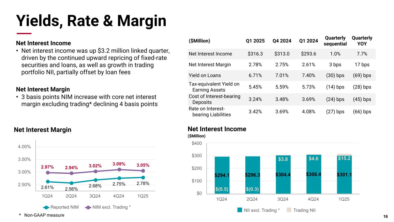 Pri m ar y & se co nd ar y br an d co lor s Data viz colors Data viz monochromatic Credit Quality Metrics • Credit quality remains very strong with non-performing assets, excluding loans guaranteed by U.S. government agencies, totaling $79 million or 0.33% of outstanding loans and repossessed assets • Trailing 12 months net charge-offs at 4 bps with net charge-offs of $1.1 million during Q1 • CRE office exposure is 3% of outstanding period end total loan balances, with properties in resilient markets • No provision for credit losses was necessary for the quarter, a combined allowance for credit losses of $331 million or 1.40% at quarter end Net Charge-Offs to Average Loans NPA (ex Govt. Guaranteed) as % of Total Loans Annualized 15 0.09% 0.11% 0.00% 0.01% 0.02% 1Q24 2Q24 3Q24 4Q24 1Q25 0.00% 0.20% 0.40% 0.60% 19.1% 18.0% 9.4% 11.2% 11.3% 12.0% 10.1% 4Q18 4Q19 1Q24 2Q24 3Q24 4Q24 1Q25 —% 10.0% 20.0% 30.0% Committed Criticized Assets / Tier 1 Capital & Reserves 1Q 20 2Q 20 3Q 20 4Q 20 1Q 21 2Q 21 3Q 21 4Q 21 1Q 22 2Q 22 3Q 22 4Q 22 1Q 23 2Q 23 3Q 23 4Q 23 1Q 24 2Q 24 3Q 24 4Q 24 1Q 25 —% 0.25% 0.50% 0.75% 1.00% 1.25% 1.50% 1.75%