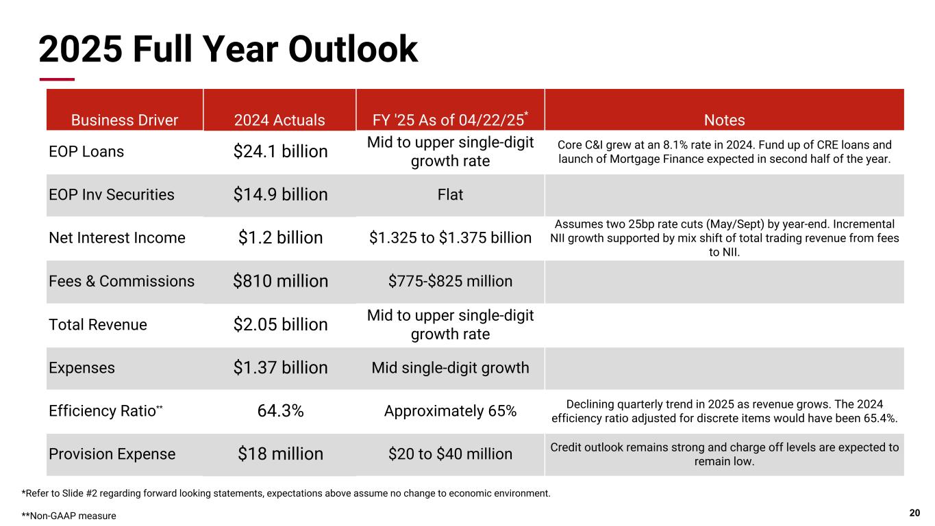 Pri m ar y & se co nd ar y br an d co lor s Data viz colors Data viz monochromatic 2025 Full Year Outlook 20 *Refer to Slide #2 regarding forward looking statements, expectations above assume no change to economic environment. **Non-GAAP measure Business Driver 2024 Actuals FY '25 As of 04/22/25* Notes EOP Loans $24.1 billion Mid to upper single-digit growth rate Core C&I grew at an 8.1% rate in 2024. Fund up of CRE loans and launch of Mortgage Finance expected in second half of the year. EOP Inv Securities $14.9 billion Flat Net Interest Income $1.2 billion $1.325 to $1.375 billion Assumes two 25bp rate cuts (May/Sept) by year-end. Incremental NII growth supported by mix shift of total trading revenue from fees to NII. Fees & Commissions $810 million $775-$825 million Total Revenue $2.05 billion Mid to upper single-digit growth rate Expenses $1.37 billion Mid single-digit growth Efficiency Ratio** 64.3% Approximately 65% Declining quarterly trend in 2025 as revenue grows. The 2024 efficiency ratio adjusted for discrete items would have been 65.4%. Provision Expense $18 million $20 to $40 million Credit outlook remains strong and charge off levels are expected to remain low.