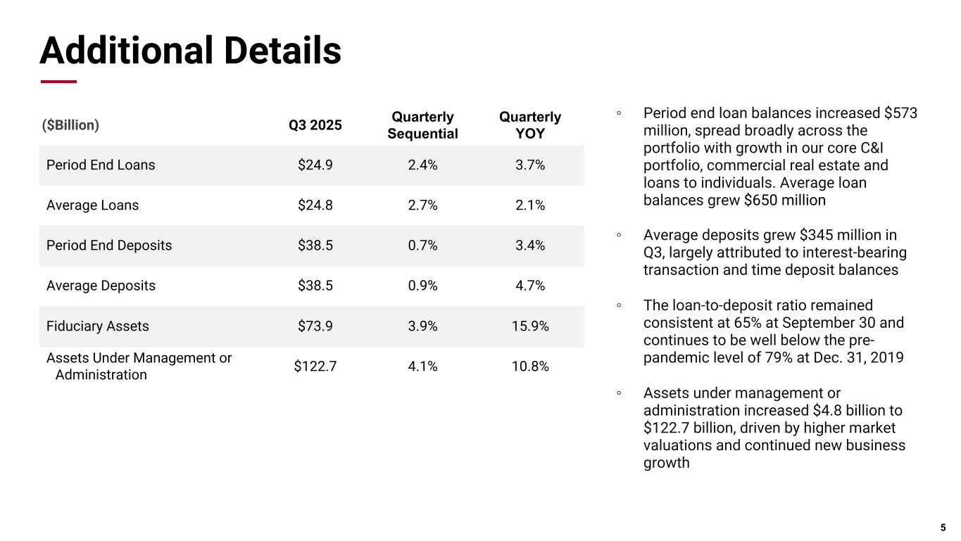 Pri m ar y & se co nd ar y br an d co lor s Data viz colors Data viz monochromatic Q3 Financial Highlights * Non-GAAP measure Attributable to shareholders Per share (diluted) Net Income • Net Income was $140.9 million, or $2.22 per diluted share • Net interest margin expanded 11 basis points to 2.91% and core net interest margin, excluding trading, grew 4 basis points to 3.16%* • Period end loans grew $573 million or 2.4% to $24.9 billion with growth in our core C&I portfolio, commercial real estate, and loans to individuals • Asset quality remains very strong with non-performing assets, excluding loans guaranteed by U.S. government agencies, totaling $67 million or 0.27% of outstanding loans and repossessed assets. Net charge-offs were $3.6 million during Q3 • Continued strong capital and liquidity position with TCE reaching 10.1% during the quarter and a loan to deposit ratio of 65% 4 $140.0 $136.2 $119.8 $140.0 $140.9 $2.18 $2.12 $1.86 $2.19 $2.22 3Q24 4Q24 1Q25 2Q25 3Q25 ($Million, exc. EPS) Q3 2025 Q2 2025 Q3 2024 Net income $140.9 $140.0 $140.0 Diluted EPS $2.22 $2.19 $2.18 Net income before taxes $176.6 $180.8 $173.3 Provision for credit losses $2.0 $0.0 $2.0 Pre-provision net revenue* $178.6 $180.7 $175.3 Efficiency ratio* 66.7% 65.4% 65.1% Revenue Composition as of 9/30/2025 62% 8% 12% 5% 6% 4% 3% Net Interest Income Trading & Brokerage Fiduciary & Asset Management Transaction Card Deposit Service Charges Mortgage Banking Other Revenue