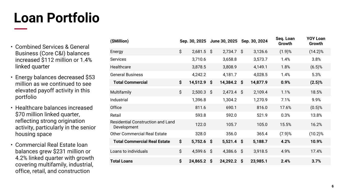 Pri m ar y & se co nd ar y br an d co lor s Data viz colors Data viz monochromatic Additional Details 5 ◦ Period end loan balances increased $573 million, spread broadly across the portfolio with growth in our core C&I portfolio, commercial real estate and loans to individuals. Average loan balances grew $650 million ◦ Average deposits grew $345 million in Q3, largely attributed to interest-bearing transaction and time deposit balances ◦ The loan-to-deposit ratio remained consistent at 65% at September 30 and continues to be well below the pre- pandemic level of 79% at Dec. 31, 2019 ◦ Assets under management or administration increased $4.8 billion to $122.7 billion, driven by higher market valuations and continued new business growth ($Billion) Q3 2025 Quarterly Sequential Quarterly YOY Period End Loans $24.9 2.4% 3.7% Average Loans $24.8 2.7% 2.1% Period End Deposits $38.5 0.7% 3.4% Average Deposits $38.5 0.9% 4.7% Fiduciary Assets $73.9 3.9% 15.9% Assets Under Management or Administration $122.7 4.1% 10.8%